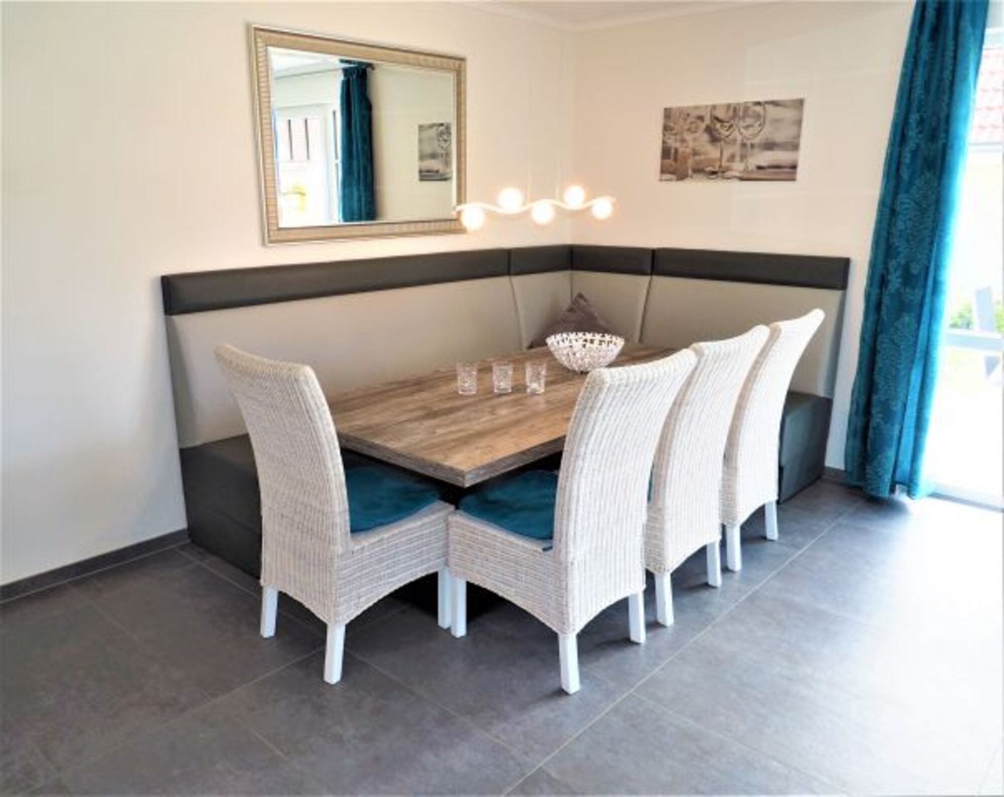 Meine Ferienhäuser sind exklusiv, komfortabel und mit viel Liebe zum Detail im Landhausstil eingerichtet. Sämtliche Räumlichkeiten sind hell und freundlich gestaltet. Die moderne und liebevolle Ausstattung lässt Ihren Urlaub zu einem unvergesslichen Erlebnis werden. Alle Fußböden sind gefliest oder mit Vinyl ausgelegt. Für warme Füße sorgt eine Fußbodenheizung. Sämtliche Betten haben Komforthöhe und sind mit verstellbaren Lattenrosten an Fuß- und Kopfteil ausgestattet. Jedes Haushälfte hat ein eigenes Farbkonzept und verfügt über: einen Kaminofen, 2 Bäder mit bodengleichen Duschen (davon ein Wellnessbad mit zusätzlicher Badewanne), hauseigene Sauna, Fliegenschutz (in Bädern und Schlafräumen), hochwertige Matratzen, Verdunkelung (in Schlafräumen), eine hochwertige und vollausgestattete Einbauküche (inkl. Spülmaschine und Waschmaschine), Safe, SAT-TV, WLAN, Fahrradschuppen und vielem mehr. Eine E-Ladestationen nur für Gäste des Doppelhauses.