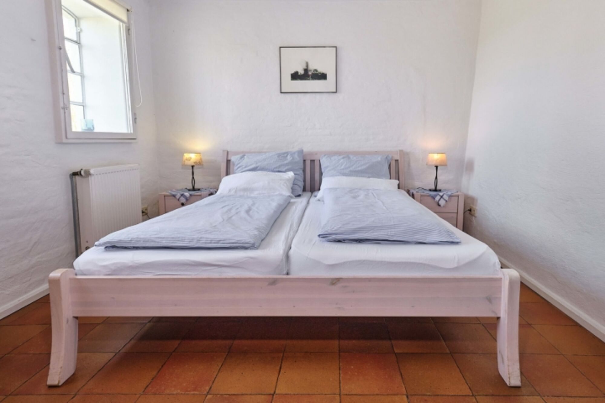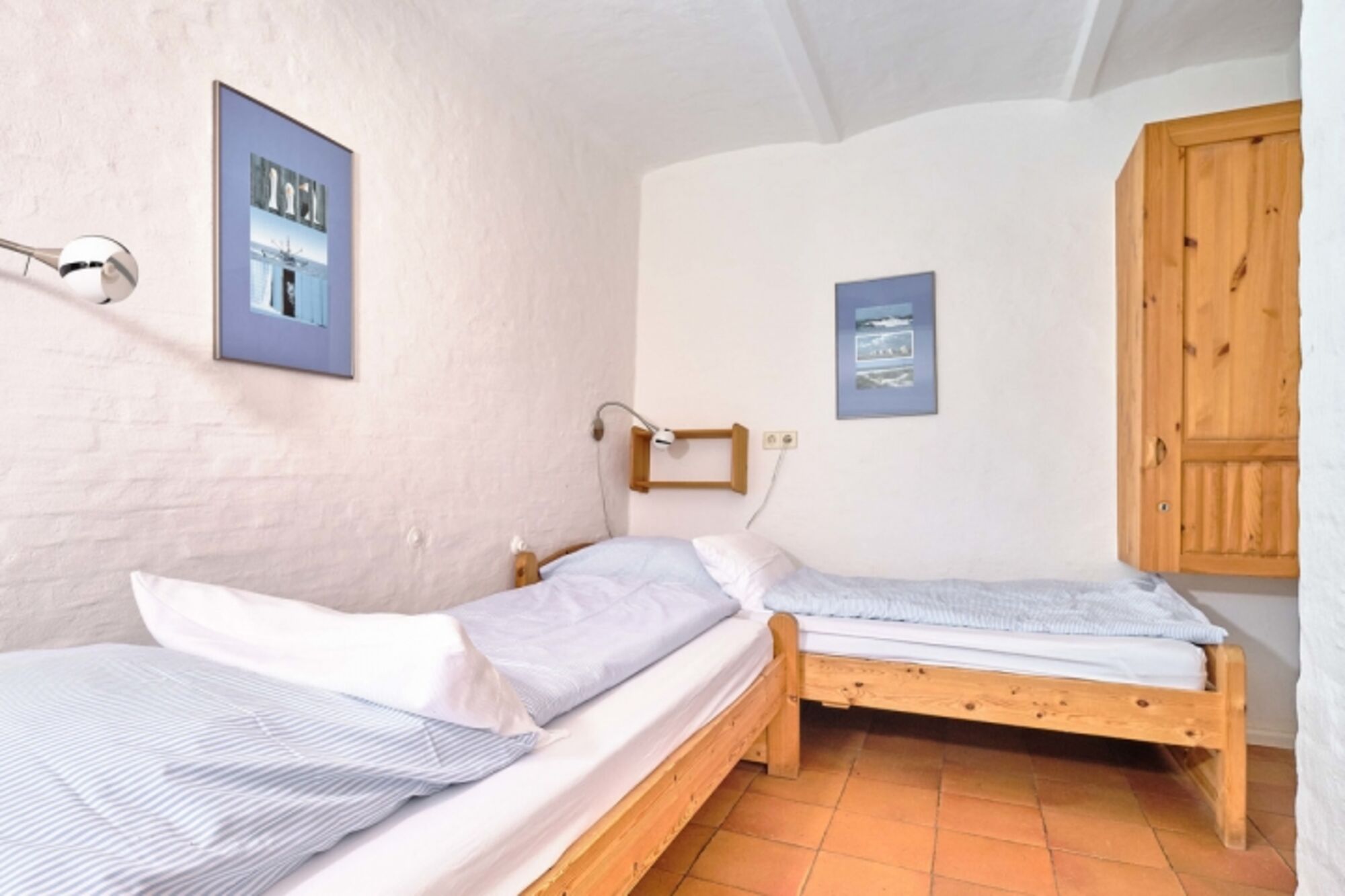 Schlafräume: 1 Schlafraum mit 1 Doppelbett im EG, 1 Schlafraum mit 2 Einzelbetten im EG, 1 Schlafraum mit 1 Doppelbett im DG; Fußboden: Fliesen im EG, Teppich im DG Doppelbett 1,80 x 2,00m, Leselampe am Bett