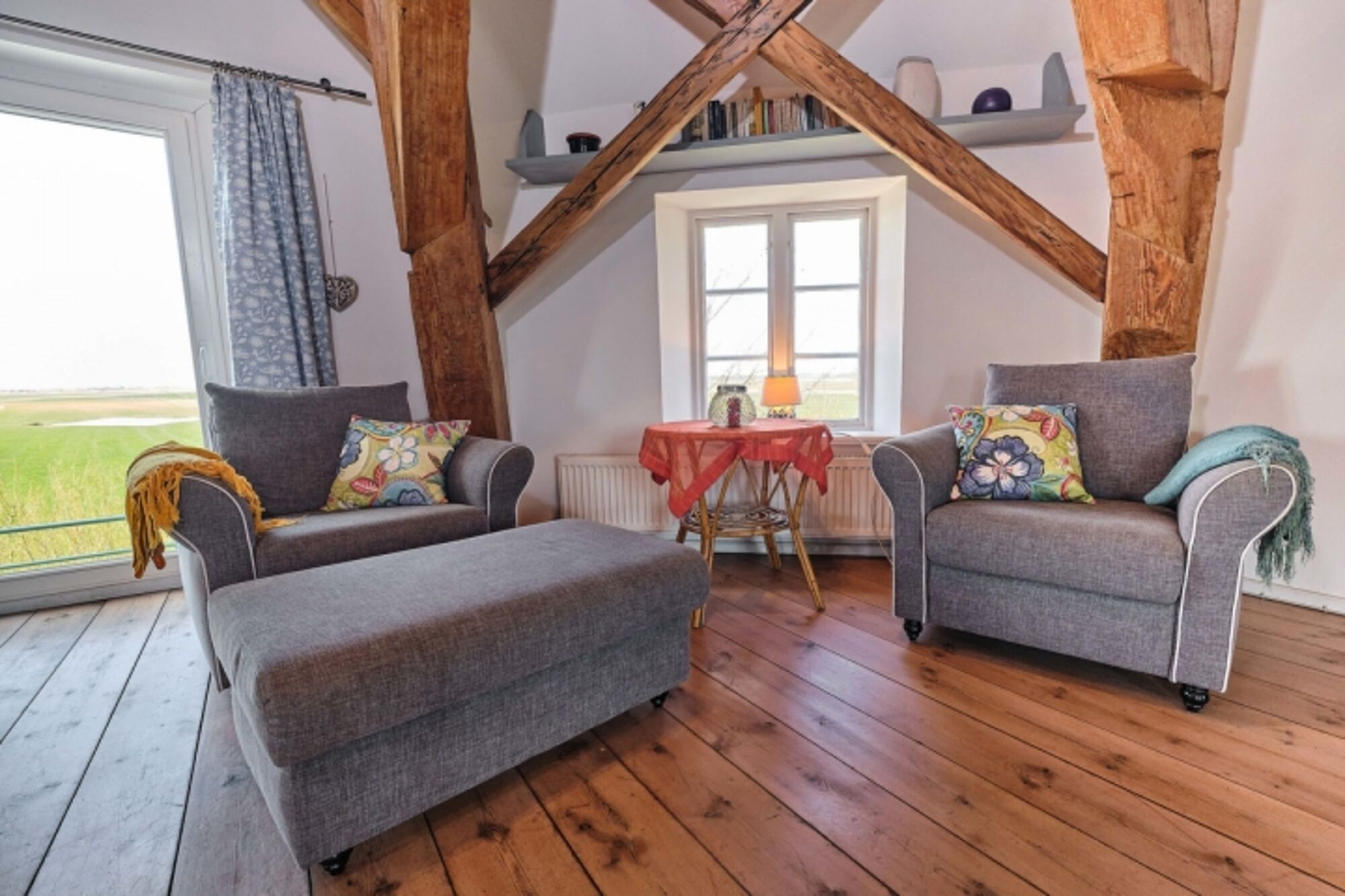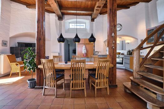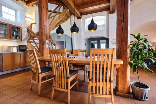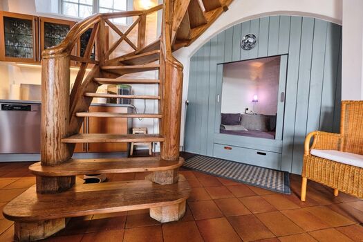 Die historische Windmühle verfügt über 1 offene Küche mit Essbereich und 1 Alkovenbett, 1 Wohnzimmer mit 2 Balkonen, 3 Schlafräume, 1 Vollbad mit WC, 1 Gäste-WC, 1 Terrasse und einem ca. 400 m² großen, eingezäunten Garten.