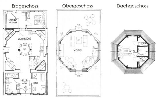 Raumaufteilung: 1 offene Küche mit Essbereich und Zugang zur Terrasse im EG, 1 Wohnzimmer mit 2 Balkonen im OG, 2 Schlafräume im EG, 1 Schlafraum im DG, 1 Vollbad mit WC im EG, 1 Gäste-WC im DG; offene Holztreppen ins OG und DG
