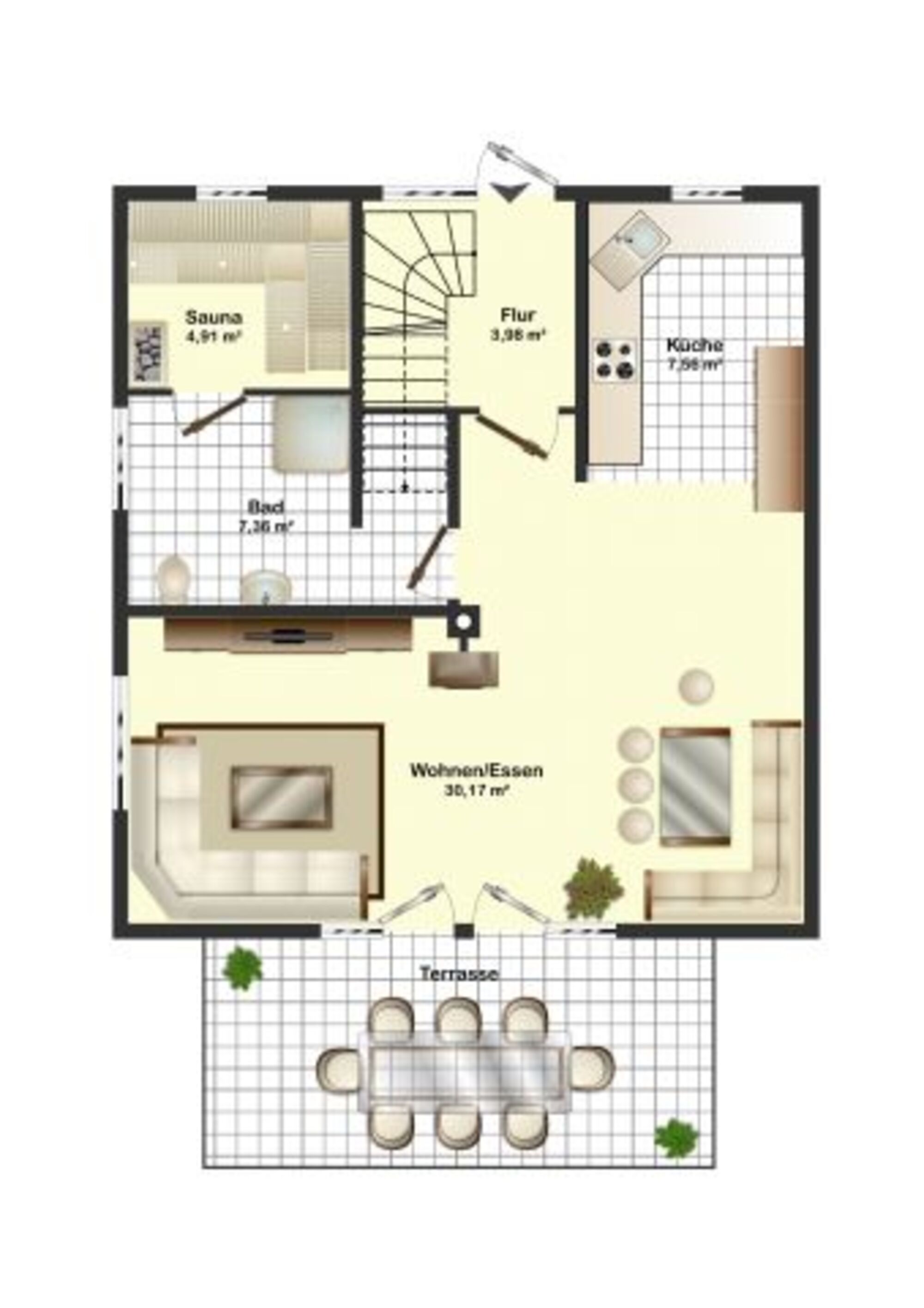 TV-Sat, TV DVB-T, TV-Flachbildschirm, DVD-Player, Blu-Ray-Player, CD-Player, Kaminofen, Eckcouch, Fliegengitter