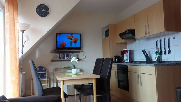 Cerankochfeld, Dunstabzugshaube, Kühlschrank mit Gefrierfach, Eierkocher, Mixer, Korkenzieher / Flaschenöffner, Gewürze (Salz, Pfeffer, Zucker), Essplatz in der Küche, TV in der Küche