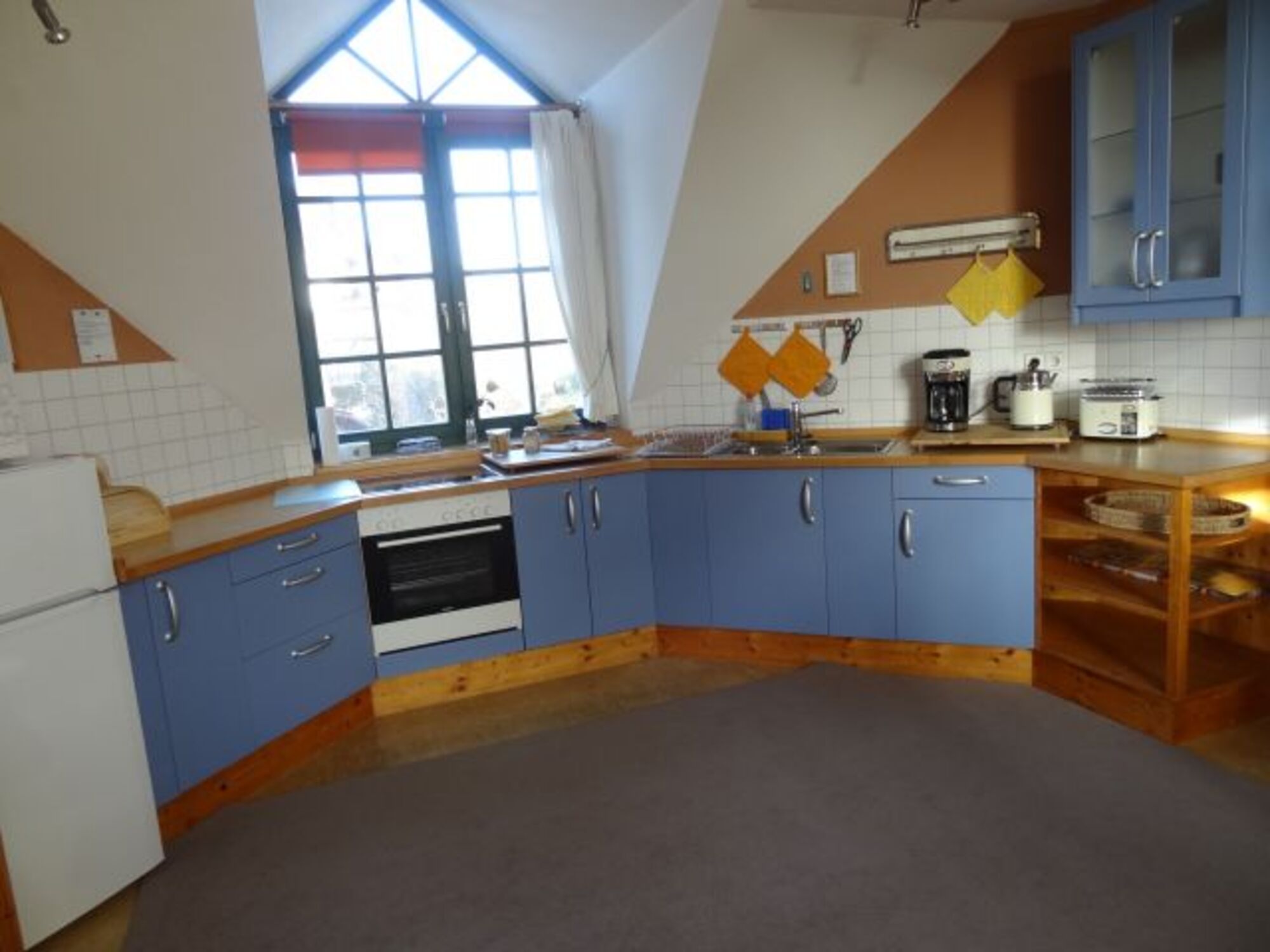 4-Platten Herd, Cerankochfeld, Kühlschrank mit Gefrierfach, Mixer, Korkenzieher / Flaschenöffner, Gewürze (Salz, Pfeffer, Zucker), Öl / Essig, Geschirrhandtücher, Mülltüten, Essplatz in der Küche