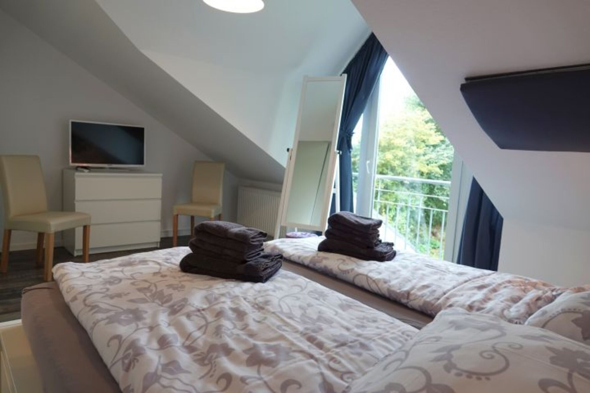 Die 2 Schlafzimmer liegen im Obergeschoss. Das Erste ist mit einem gemütlichen Doppelbett und einem Flachbild-TV ausgestattet.