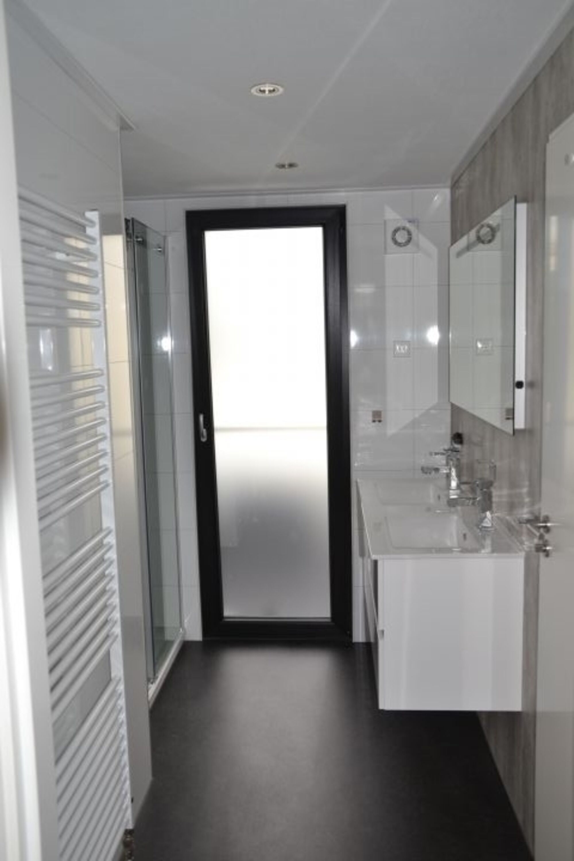 Doppelwaschbecken, Regendusche, Spiegel, Fenster im Bad