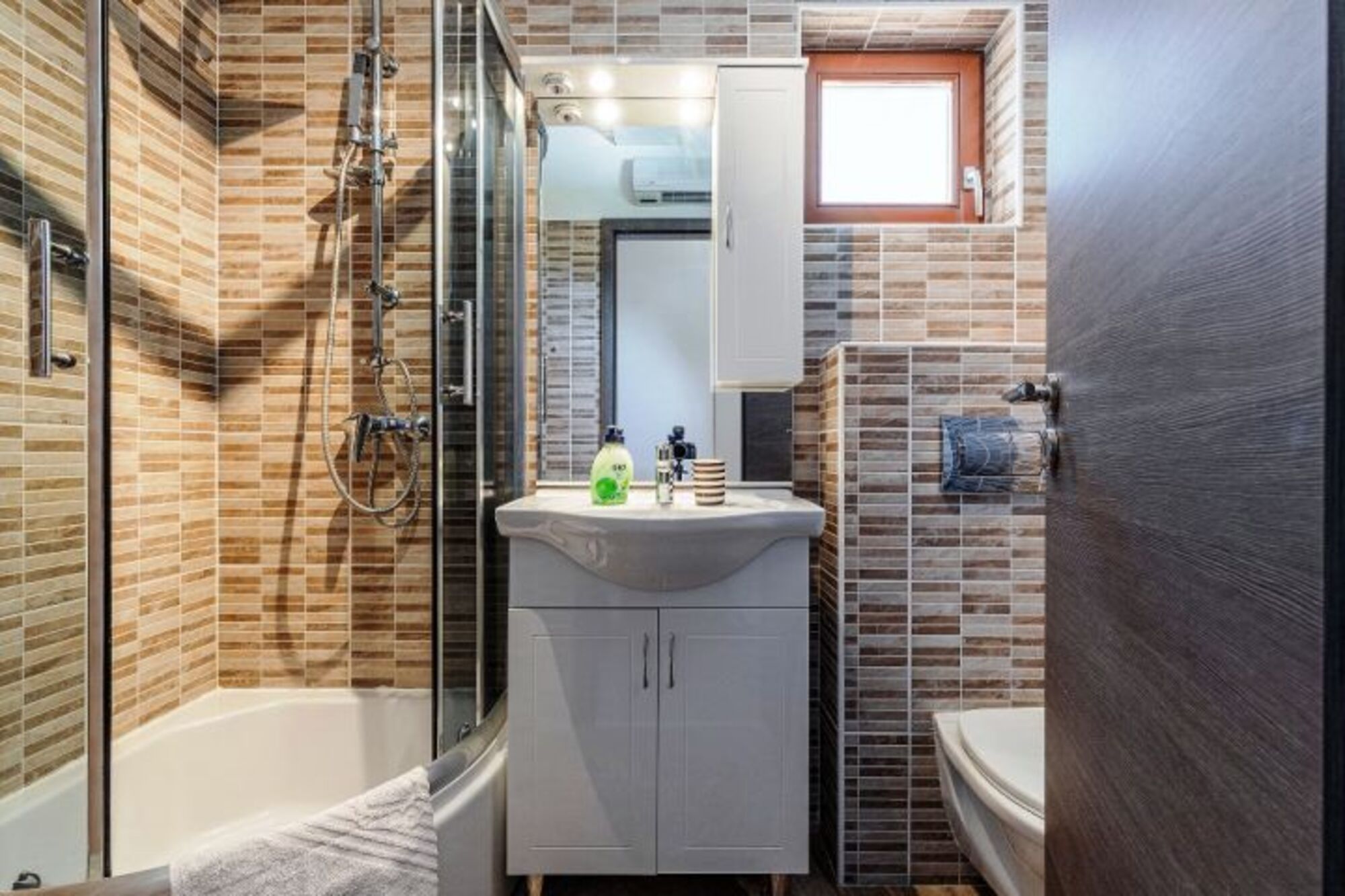 Waschbecken, Spiegel, Fenster im Bad