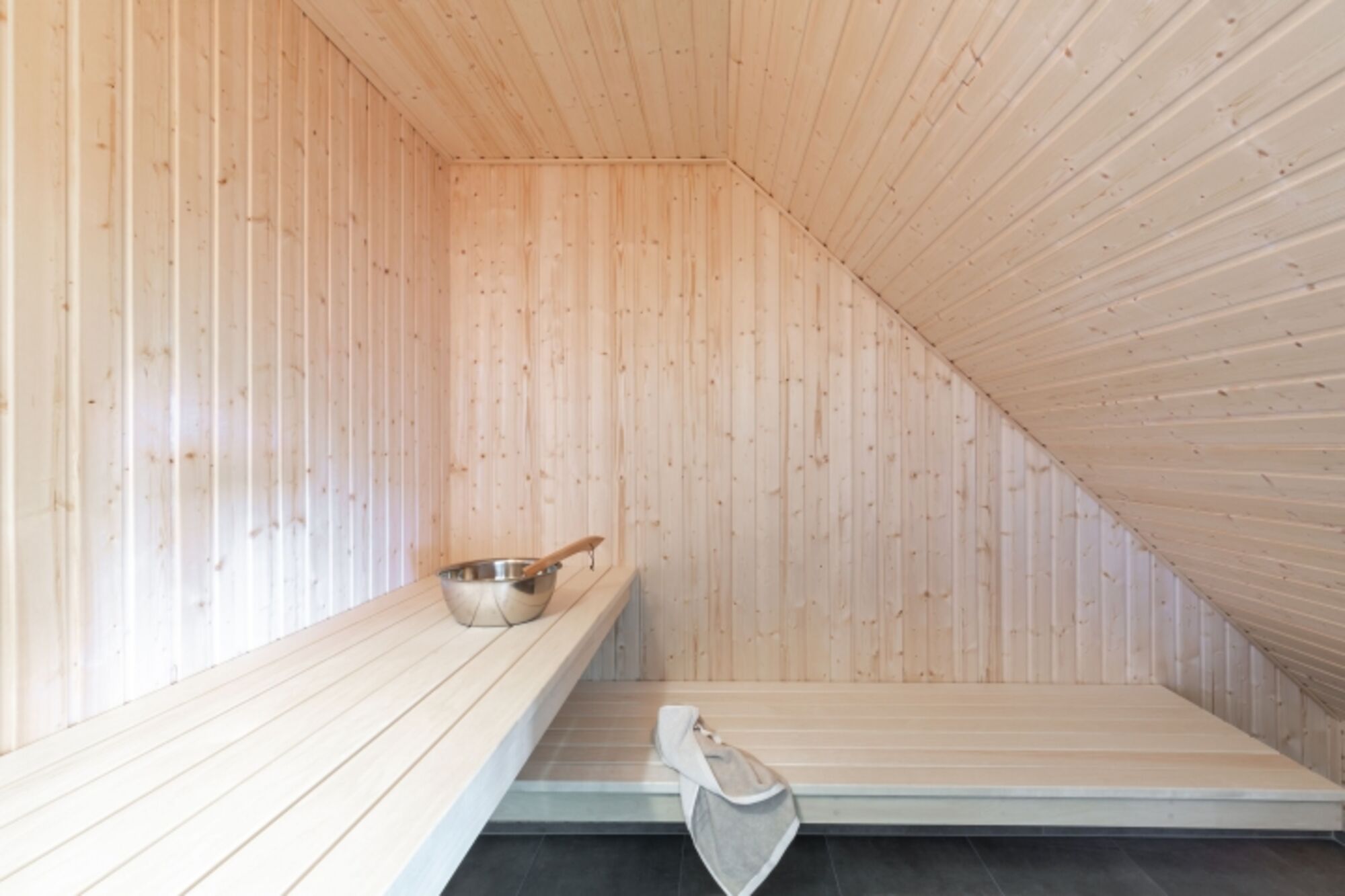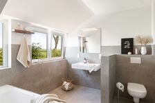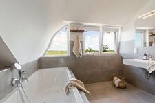 Im Dachgeschoss gibt es ebenfalls ein Badezimmer mit ebenerdiger Dusche, Sauna und Badewanne mit Whirlpool-Funktion.