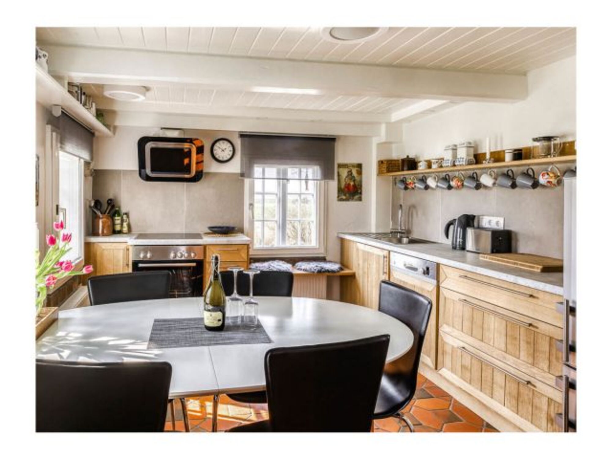 Cerankochfeld, Dunstabzugshaube, Gefrierschrank, Senseo-Kaffeeautomat, Eierkocher, Mixer, Korkenzieher / Flaschenöffner, Geschirrhandtücher, Mülltüten, Essplatz in der Küche