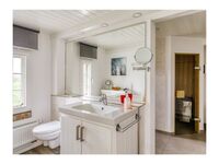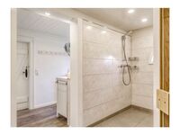 Das Bad im Erdgeschoss ist das Hauptbad mit großem Duschbereich und Sauna.