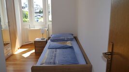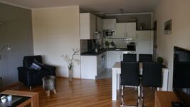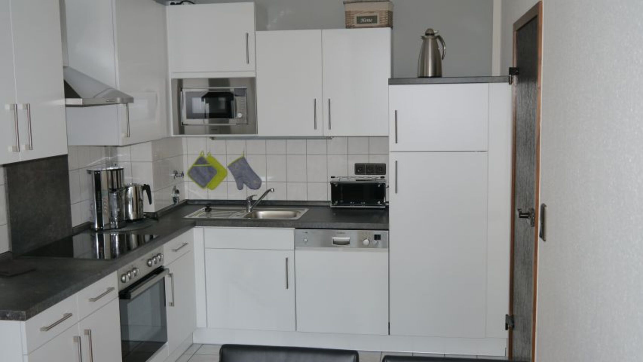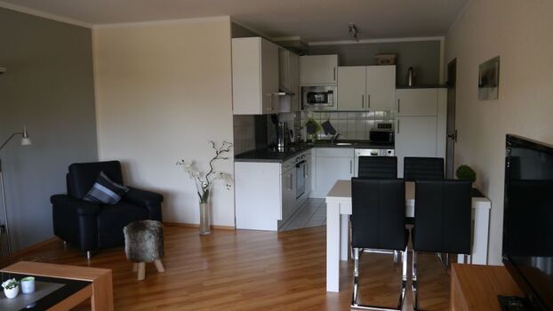 Die Ferienwohnung besteht aus einem Wohnzimmer, welches eine 3sitzer Schlafcouch und einen Sessel beinhaltet. Dazu gibt es eine Essecke im Raum, wo Sie eine vollwertige Einbauküche vorfinden. Selbstverständlich ist die Ferienwohnung mit Spülmaschine, Herd und Mikrowelle, damit die Selbstverpflegung bequem ausfällt. Weiterhin gibt es ein Schlafzimmer mit einem Doppelbett von 2 m x 1,80 m. Das weitere Zimmer enthält ein Einzelbett. Ein Kinderreisebett können wir Ihnen zusätzlich zur Verfügung stellen.