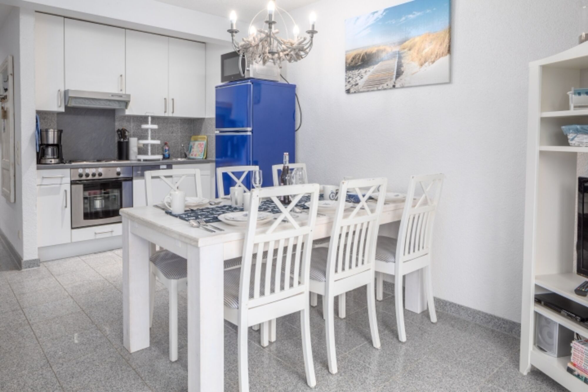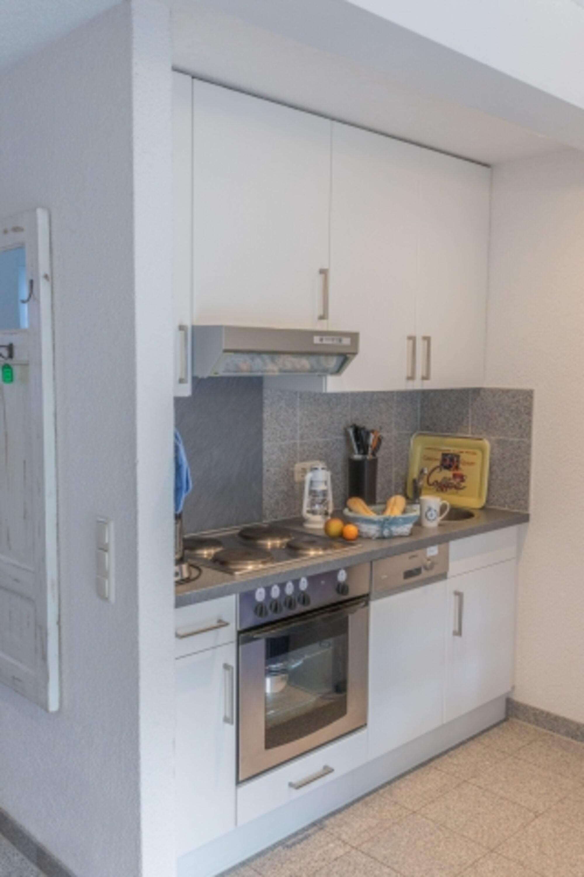 4-Platten Herd, Dunstabzugshaube, Kühlschrank mit Gefrierfach, Senseo-Kaffeeautomat, Eierkocher, Mülltüten, Essplatz in der Küche, TV in der Küche