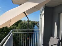 Ein großzügiger, möblierter und überdachter, nach Süden zum Wasserlauf ausgerichteter Balkon lädt zum Verweilen ein.