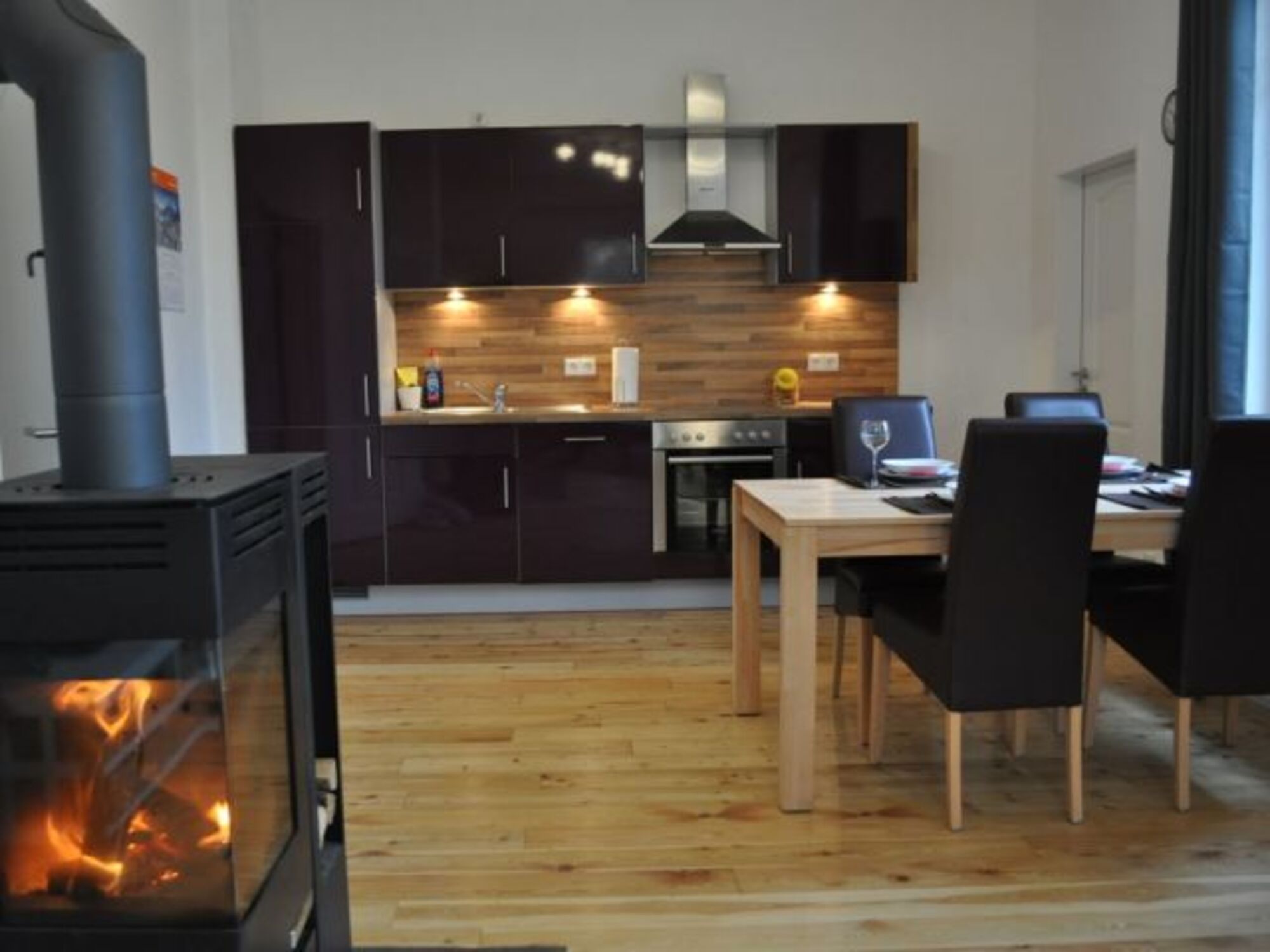 4-Platten Herd, Cerankochfeld, Dunstabzugshaube, Kühlschrank mit Gefrierfach, Mixer, Korkenzieher / Flaschenöffner, Geschirrhandtücher, Mülltüten, Essplatz in der Küche