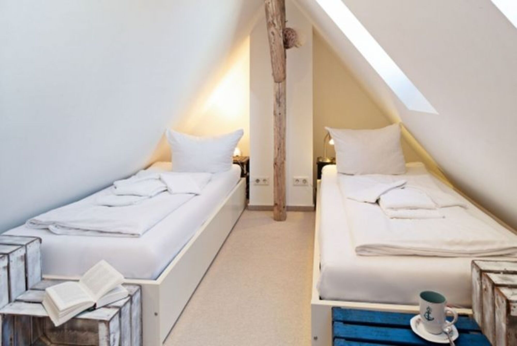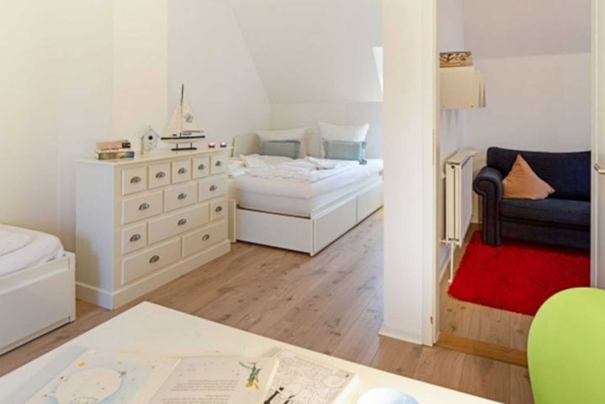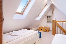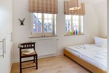 Mit drei Schlafzimmern, drei Bädern, einem Aufenthaltsraum mit Sofa und Fernseher und einem Wohnzimmer mit angrenzender offener Küche ist Platz für bis zu sechs Personen. Im 1. OG (geschlossene Treppe) befindet sich ein Schlafzimmer mit Doppelbett und ein Schlafzimmer mit zwei Einzelbetten, die auch zu einem Doppelbett ausgezogen werden können. In das Dachgeschoss führt eine eher stark ansteigende, offene Treppe mit einem weiteren Schlafzimmer mit zwei Einzelbetten. Im Außenbereich lädt Ihr sonniger Garten mit großer Terrasse mit Strandkorb und Gartenmöbeln zum Relaxen ein.