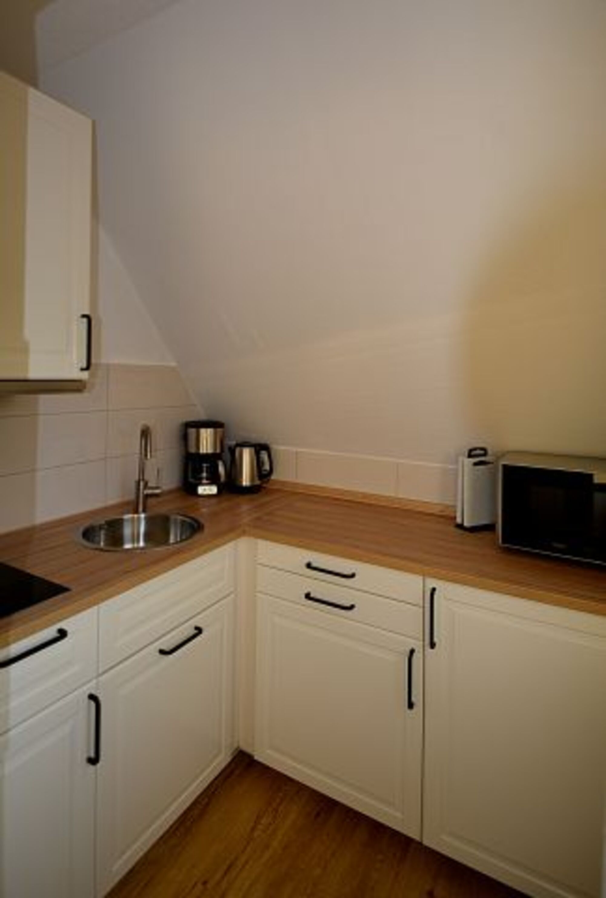 Cerankochfeld, Dunstabzugshaube, Kühlschrank mit Gefrierfach, Mixer, Korkenzieher / Flaschenöffner, Gewürze (Salz, Pfeffer, Zucker), Geschirrhandtücher, Mülltüten