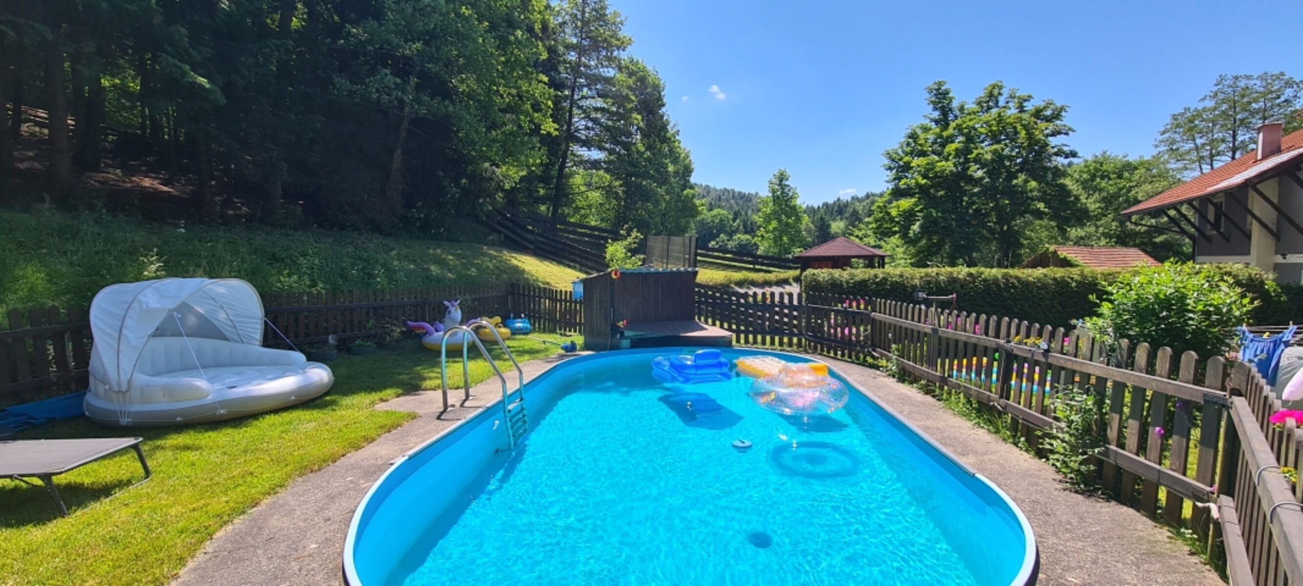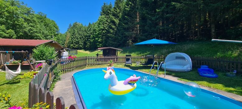 Der Swimmingpool wird ebenfalls auch von den Gästen unserer Ferienwohnung Wald Kobel genutzt, welche sich neben dem Grundstück des Ferienhauses befindet.