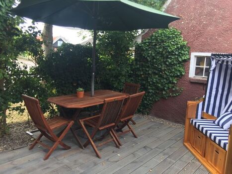 Zum Haus gehört eine große Holzterrasse mit Gartenmöbeln.