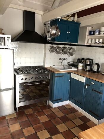 Eine gut ausgestattete Holzküche mit einem großen, modernen 5 Flammen Gasherd,sowie einer Kühl/Gefrierkombination, einem Bad mit ebenerdiger Dusche, Infrarotsauna, Waschmaschine, Fußbodenheizung plus einem Heizkörper.