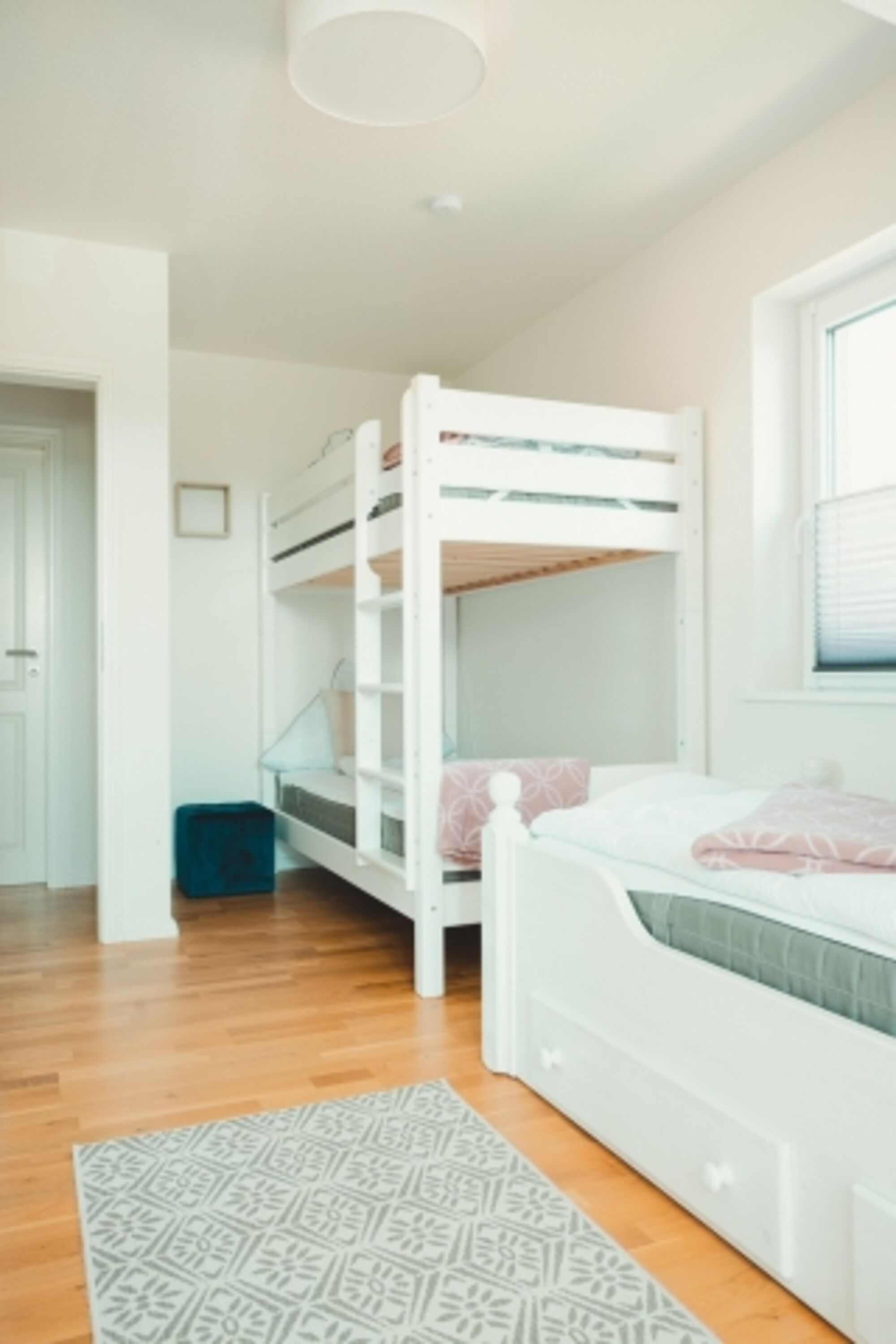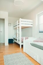 Insgesamt 2 Schlafzimmer bieten den Gästen dieser Unterkunft reichlich nächtlichen Komfort. Ein Schlafzimmer ist mit einem komfortablen Boxspringbett und mit Staumöglichkeiten in Form eines Kleiderschranks ausgestattet. Das Boxspringbett bietet mit 160 X 200 und offenen Fußenden viel Platz für gemütliche und erholsame Nächte. Das zweite Schlafzimmer verfügt über ein gemütliches Einzelbett 90x200 und ein auch für Erwachsene geeignetes Etagenbett 90X200. Auch hier wurde an Stauflächen gedacht, so dass das eigene Gepäck in diesem Ferienhaus bequem untergebracht werden kann.