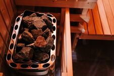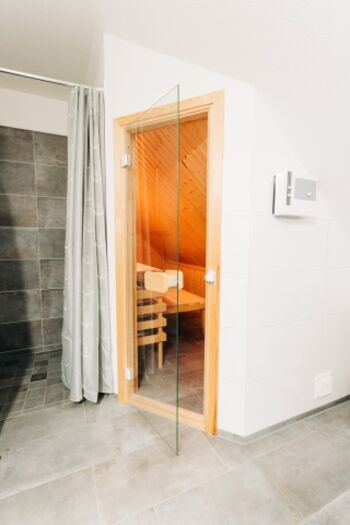 Das Haus verfügt über zwei großzügige Badezimmer mit modernen, grauen Wand- und Bodenfliesen. Beide Bäder sind mit einem Fenster, einer bodentiefen Dusche, Handtuchhaltern, Waschbecken mit Spiegel und WC ausgestattet. Die behagliche finnische Sauna bietet bis zu 4 Personen Platz.