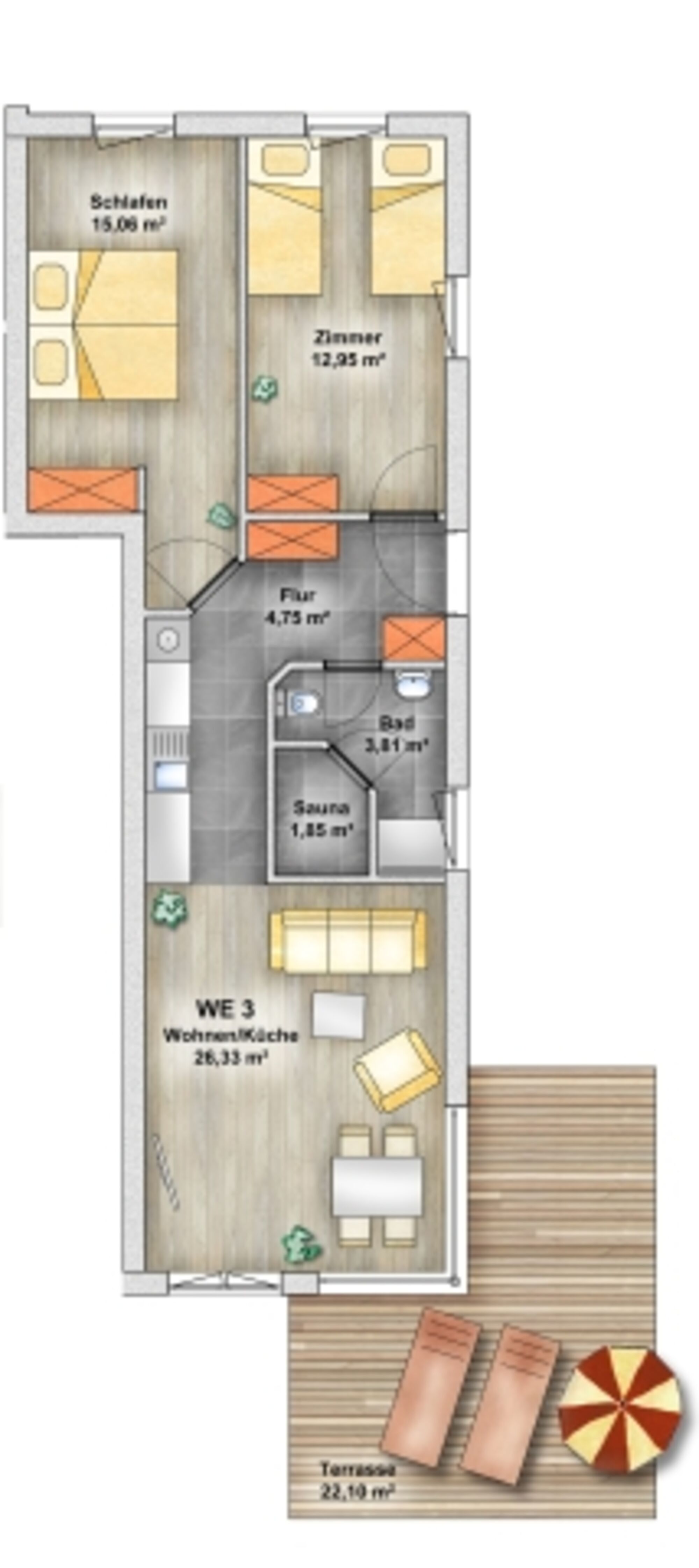 Die ca. 76 qm große Ferienwohnung bietet für maximal 4 Personen Platz und ist für eine Familie ideal geeignet.
