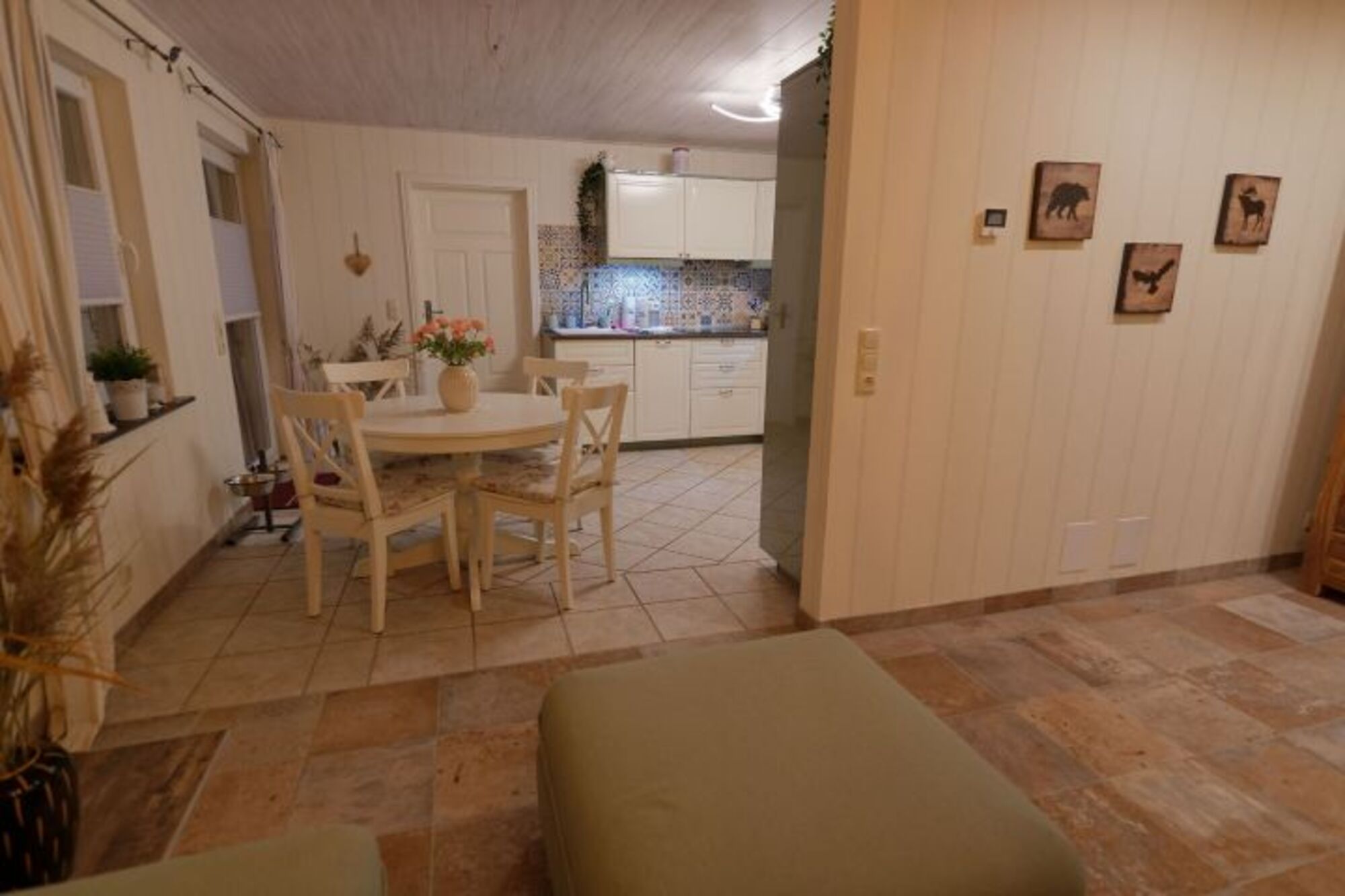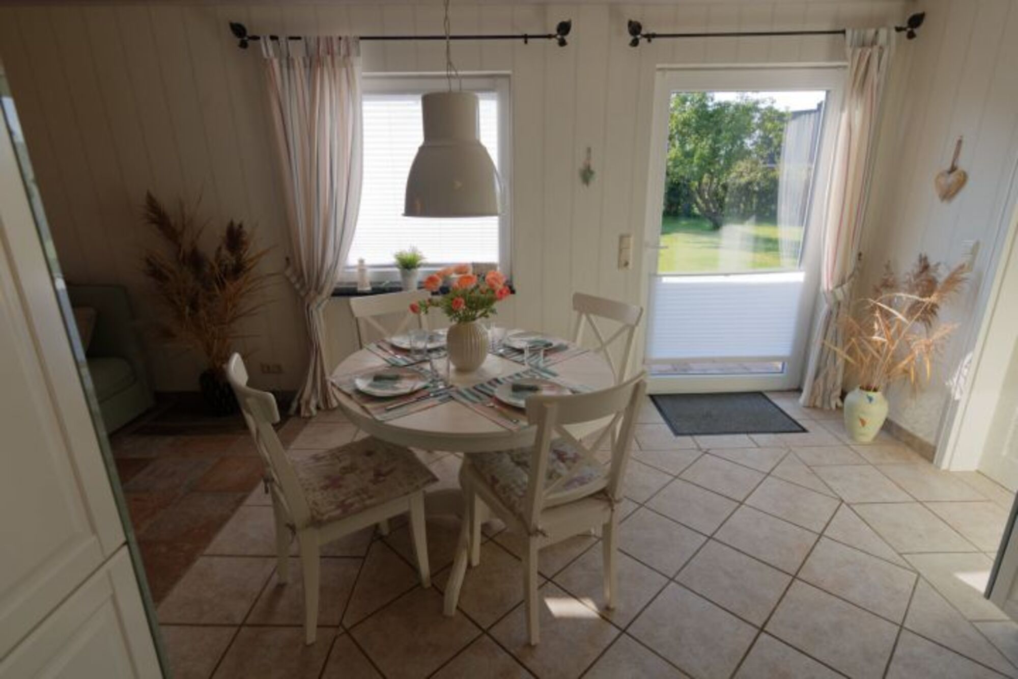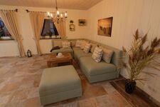 Wenn Sie nach einem langen Tag am Strand ins Haus kommen, lädt das gemütliche Wohnzimmer zum Ausruhen ein. Lassen Sie sich auf unserer gemütlichen Sitzgruppe nieder und genießen Sie ein Glas Wein. Der Wohnbereich ist geräumig und zur angrenzenden Küche hin offen, sodass niemand das Essen allein zubereiten muss. Wir haben alle Räume in hellen Farben gestaltet, so, dass am Abend die Stimmung noch einmal an den vergangenen Sommertag erinnert.