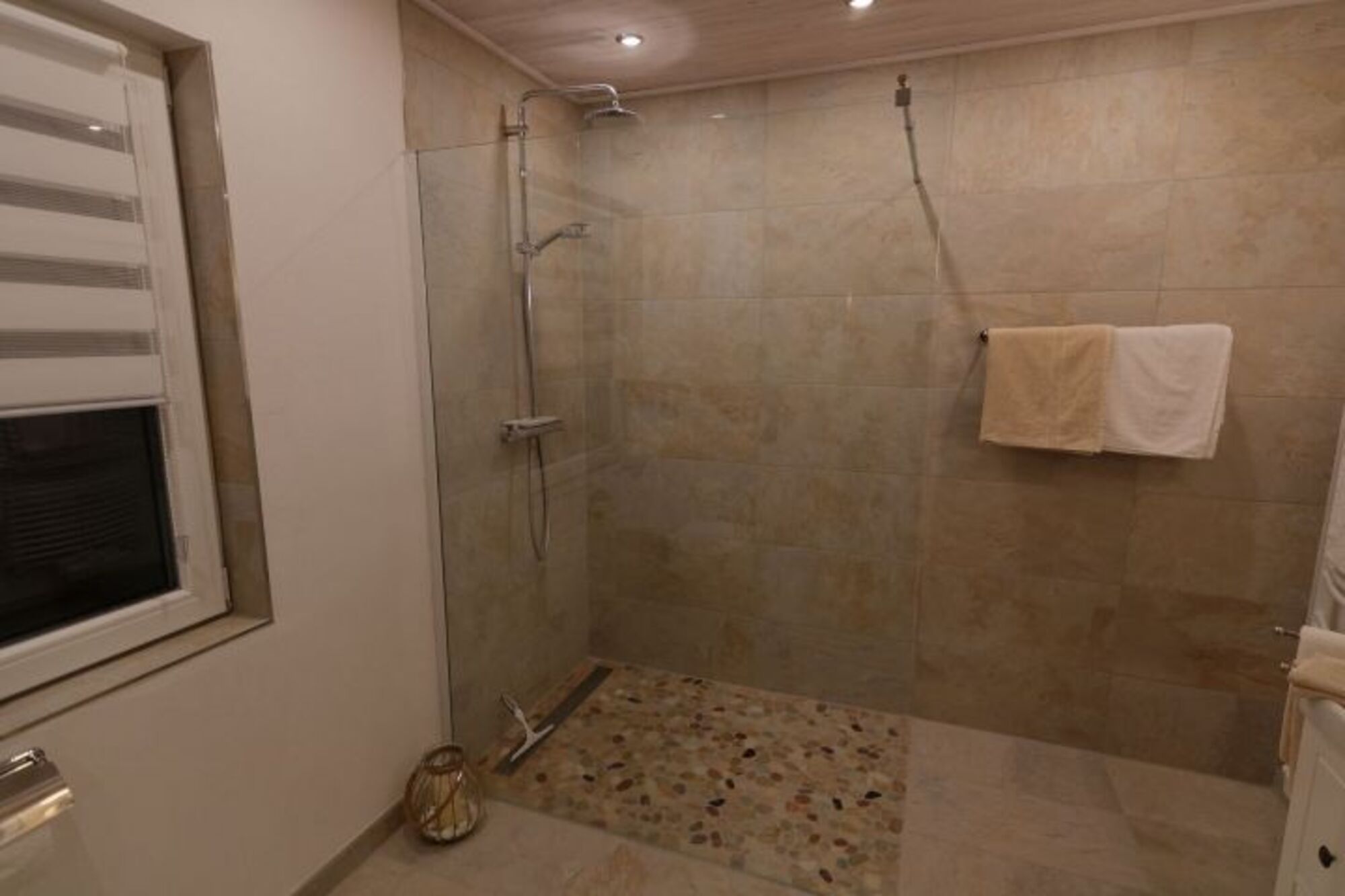 Ihren Urlaubstag beginnen Sie in unserem luxuriösen Badezimmer mit großzügiger Walk-In RegenDusche mit rutschhemmendem Kieselsteinboden.