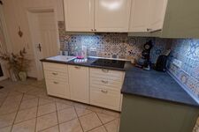 Induktionsherd, Dunstabzugshaube, Gefrierschrank, Senseo-Kaffeeautomat, Eierkocher, Mixer, Korkenzieher / Flaschenöffner, Gewürze (Salz, Pfeffer, Zucker), Öl / Essig, Geschirrhandtücher, Mülltüten, Essplatz in der Küche, TV in der Küche