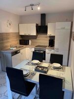 Cerankochfeld, Dunstabzugshaube, Kühlschrank mit Gefrierfach, Eierkocher, Mixer, Korkenzieher / Flaschenöffner, Geschirrhandtücher, Essplatz in der Küche
