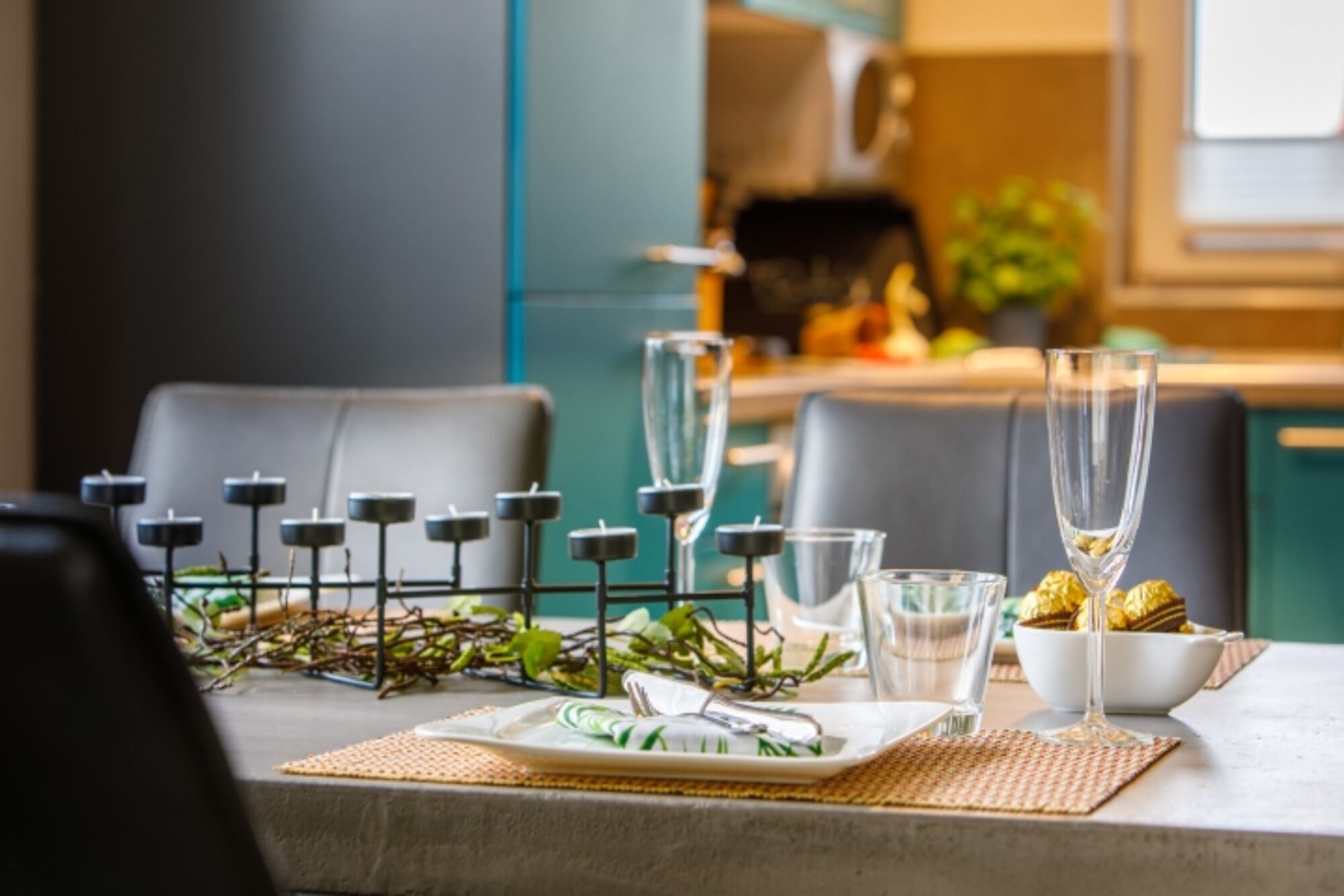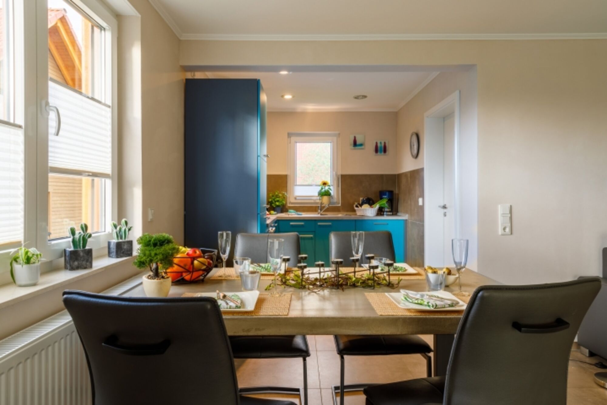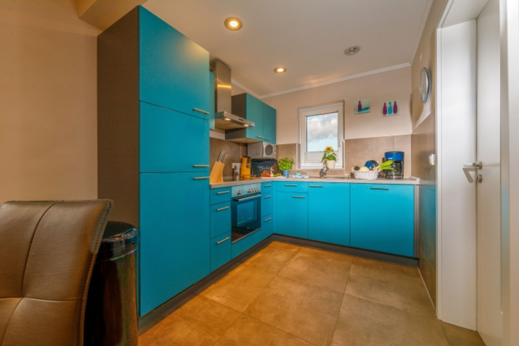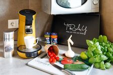 1 moderne vollausgestattete Küche inkl. E-Herd, Kühl-/ Gefrierkombination, Spülmaschine, Mikrowelle, Wasserkocher, Toaster, Kaffeemaschine, komplettes Geschirr ….