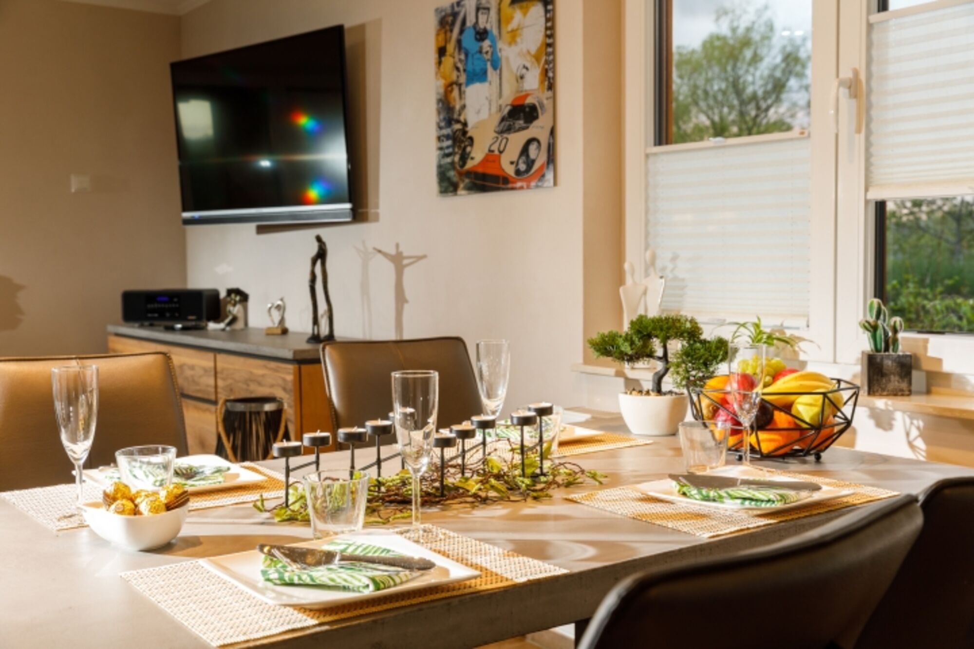 1 Wohn-/Esszimmer mit Doppelschlafcouch, virtueller Kamin, 1 Flat- SAT- TV, Radio