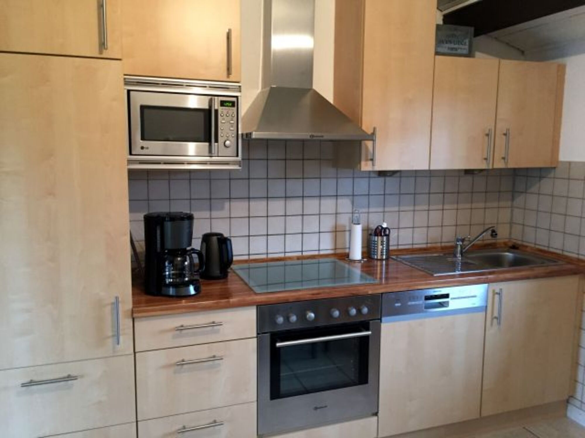 Cerankochfeld, Dunstabzugshaube, Kühlschrank mit Gefrierfach, Mixer, Korkenzieher / Flaschenöffner, Gewürze (Salz, Pfeffer, Zucker), Öl / Essig, Geschirrhandtücher, Mülltüten, Essplatz in der Küche