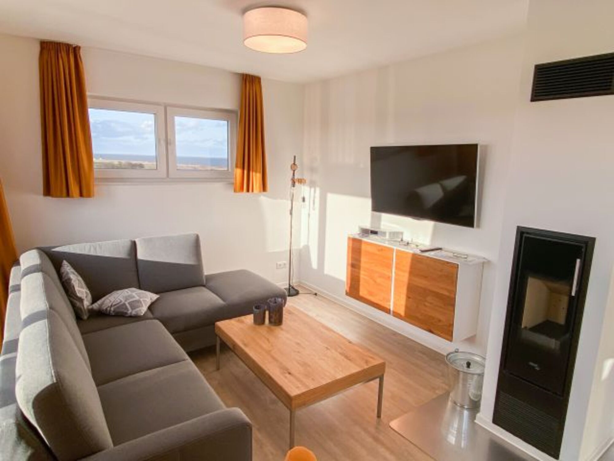 Der Wohnraum ist in warmen Farben möbliert und wird durch einen Kaminofen vollendet.