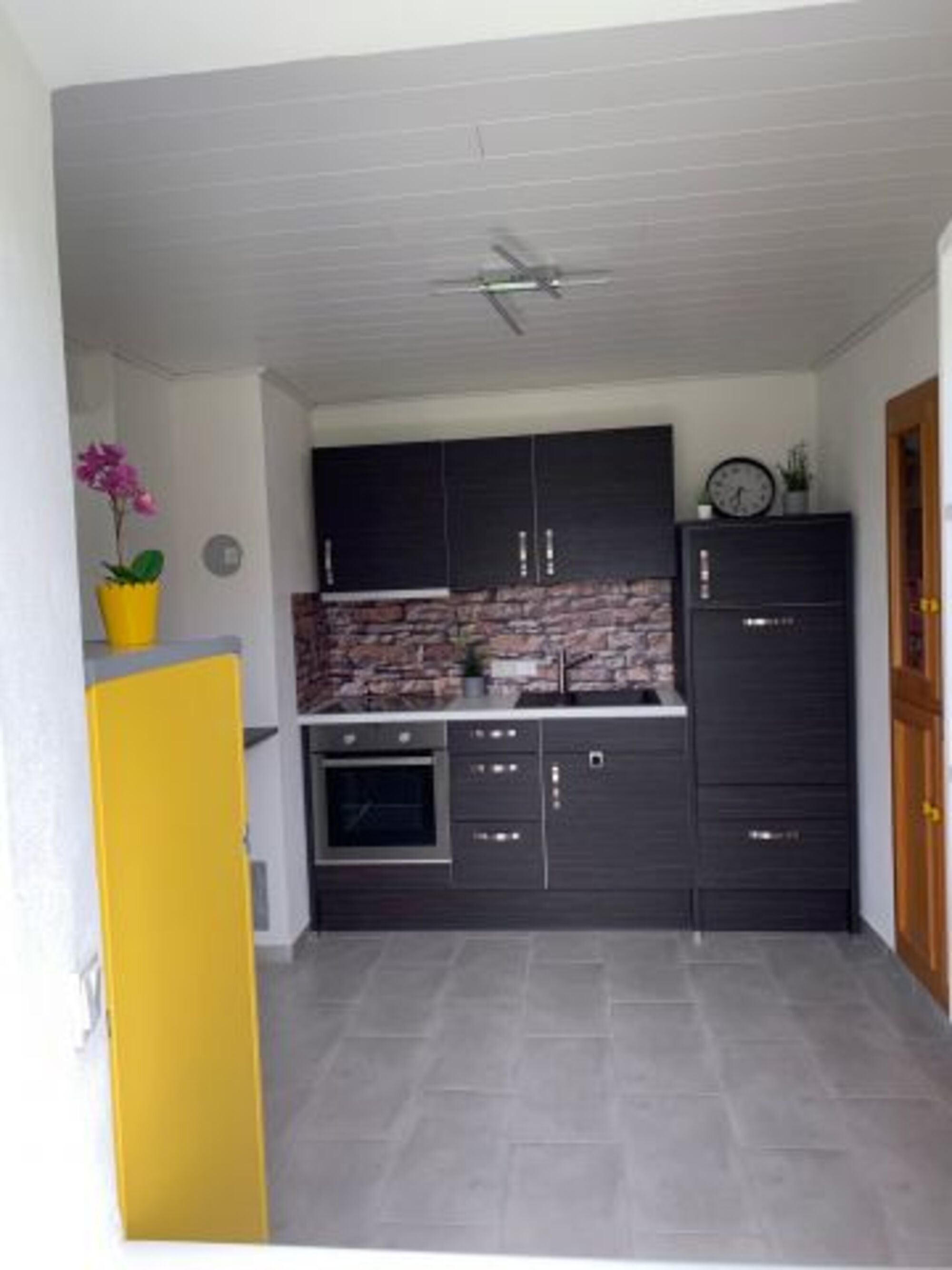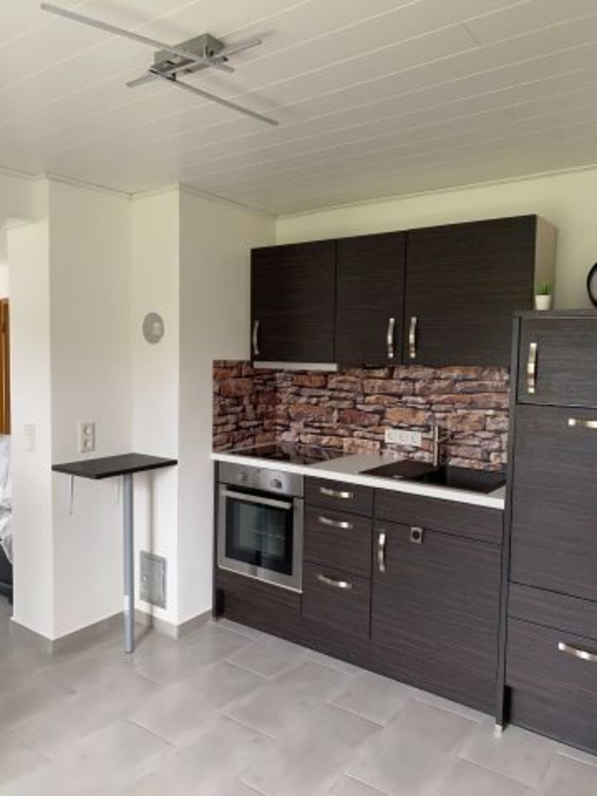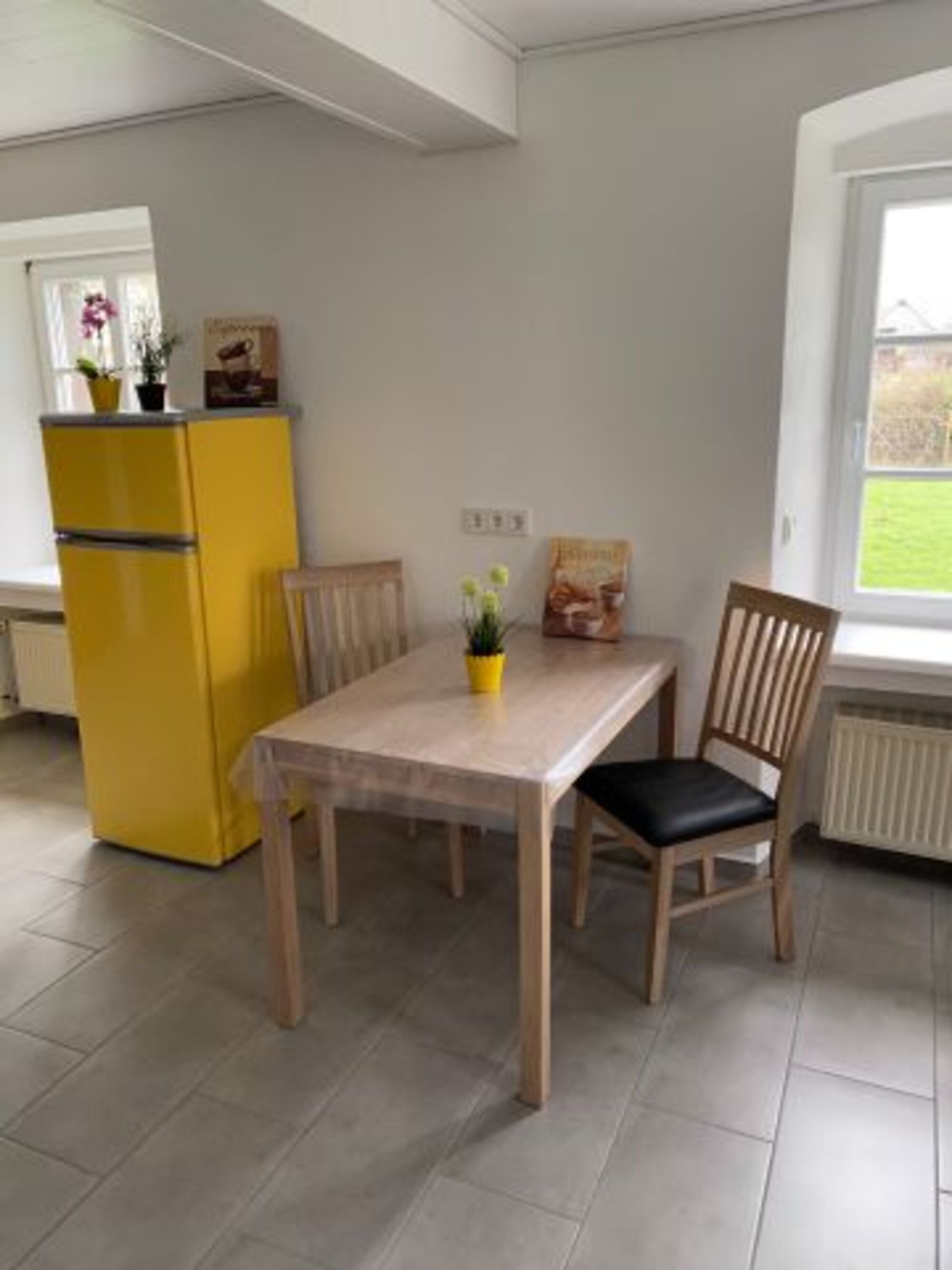 4-Platten Herd, Cerankochfeld, Dunstabzugshaube, Kühlschrank mit Gefrierfach, Eierkocher, Korkenzieher / Flaschenöffner, Gewürze (Salz, Pfeffer, Zucker), Geschirrhandtücher, Mülltüten, Essplatz in der Küche