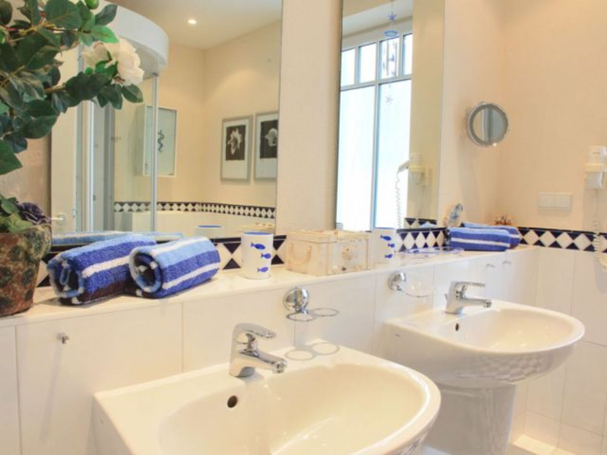 Badezimmer mit Doppeldusche für zwei Personen, Dampfsauna, zwei Waschtische, Föhn, Kosmetikspiegel
