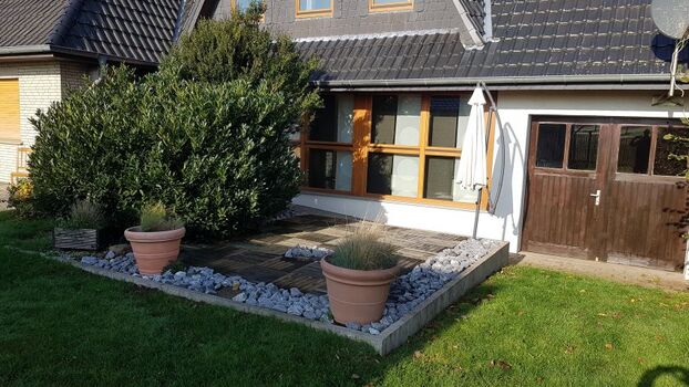 Ein Terraßenbereich zum Chillen, Sonnen, Essen und Entspannen laden Sie ein.