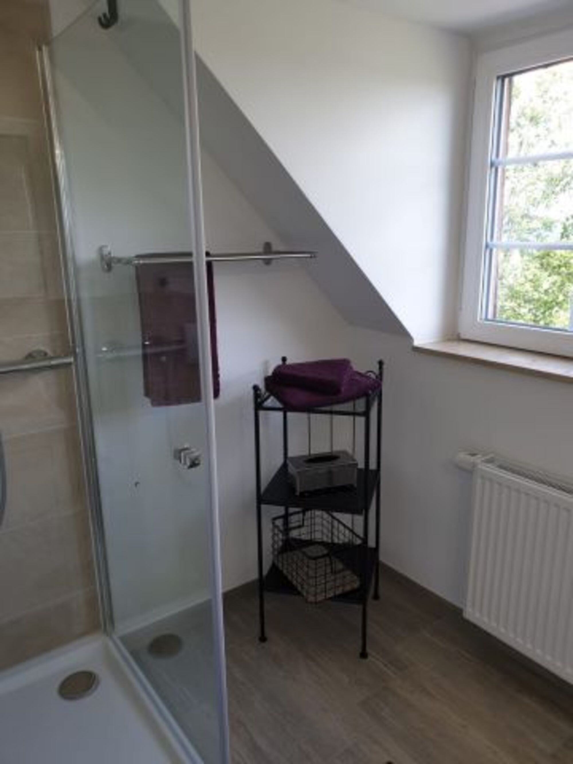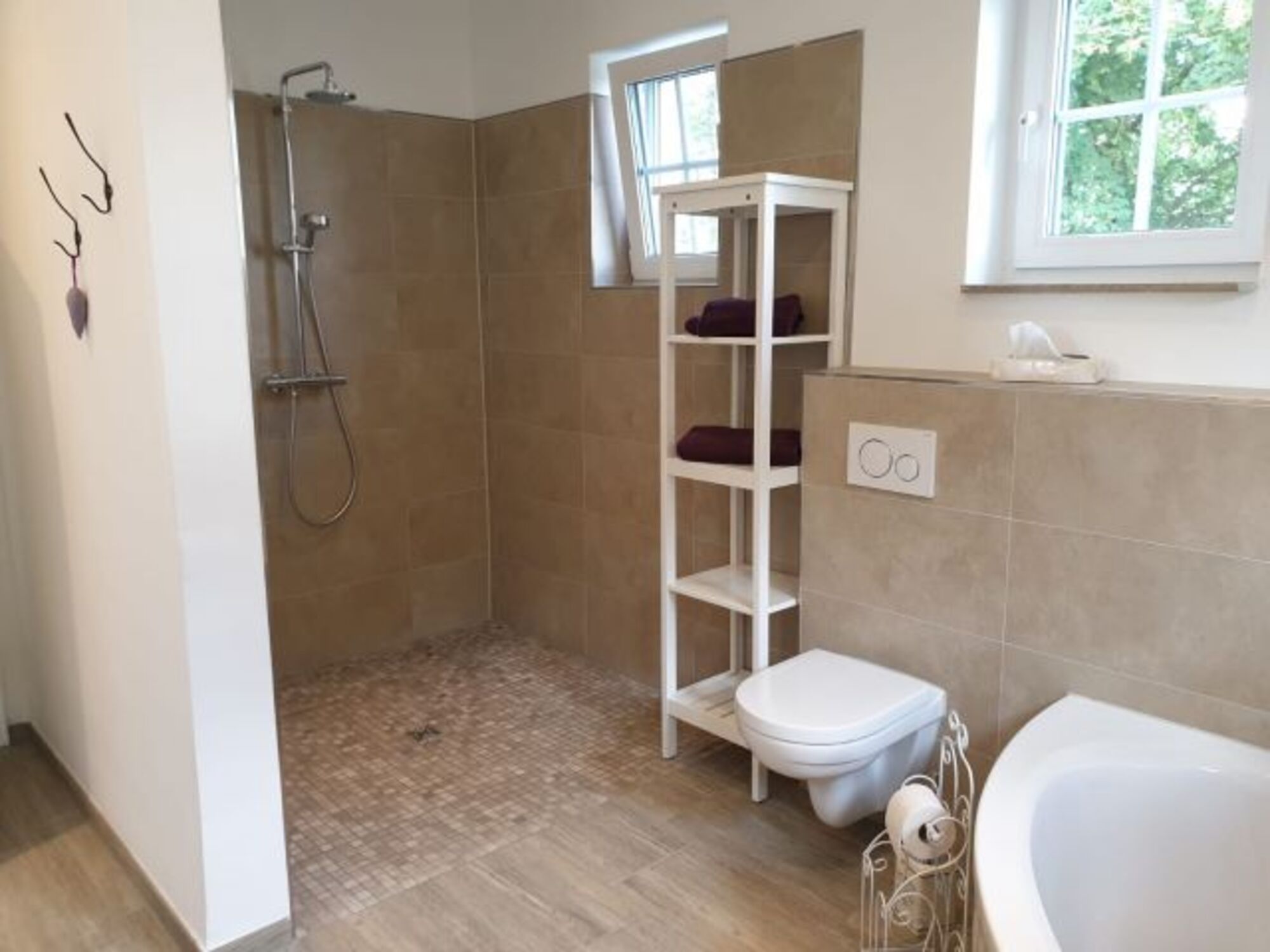 Die Dusche im EG ist ebenerdig mit einer Größe von 1.60x1.60m. Sie kann auch z.B. mit einer Gehhilfe betreten werden; Spiegel, Fenster im Bad