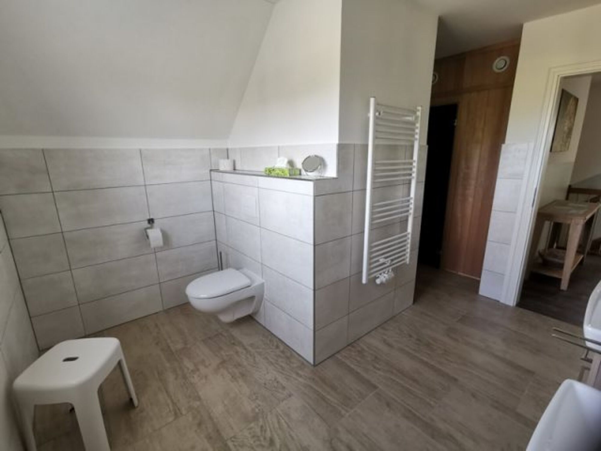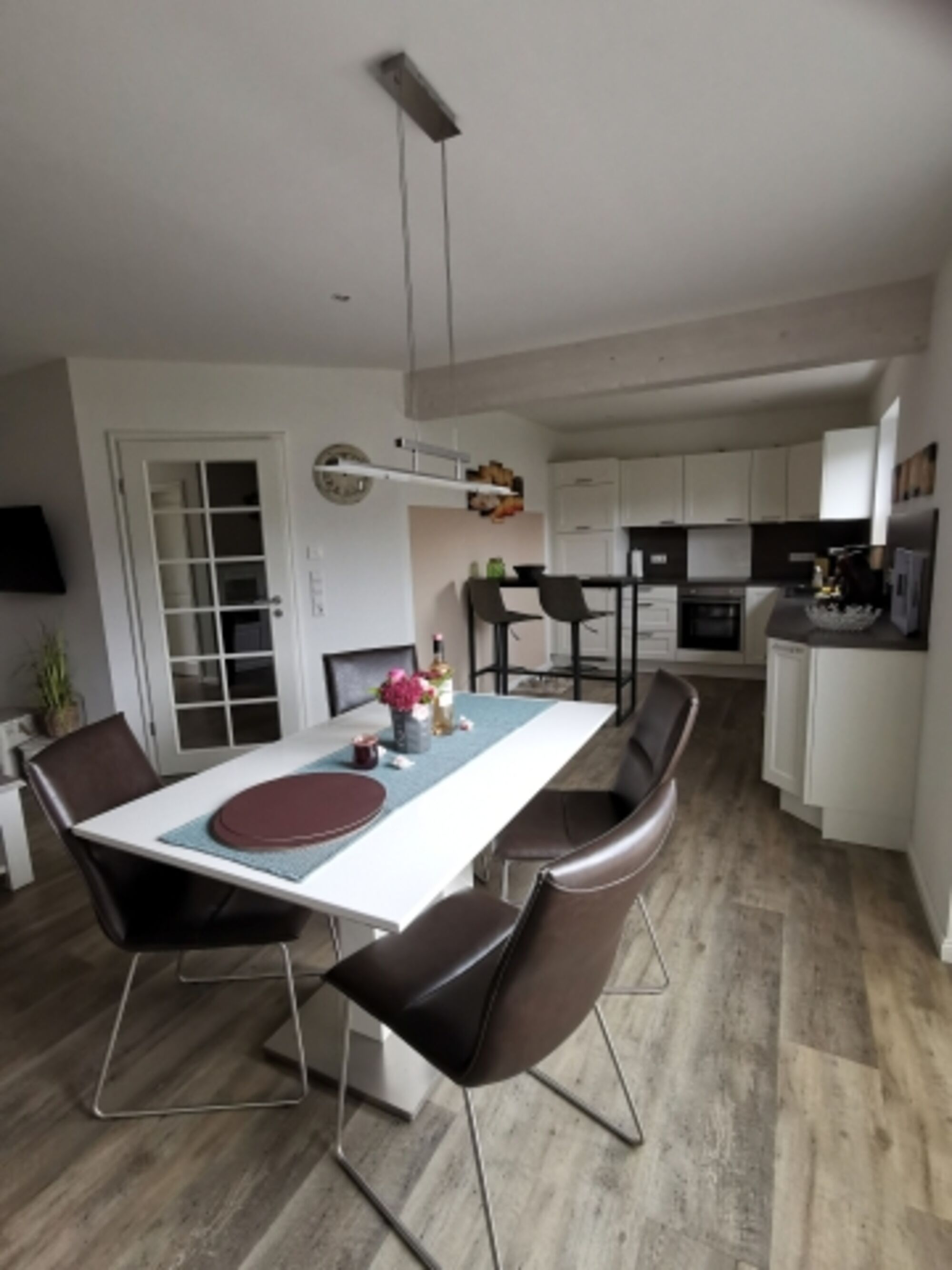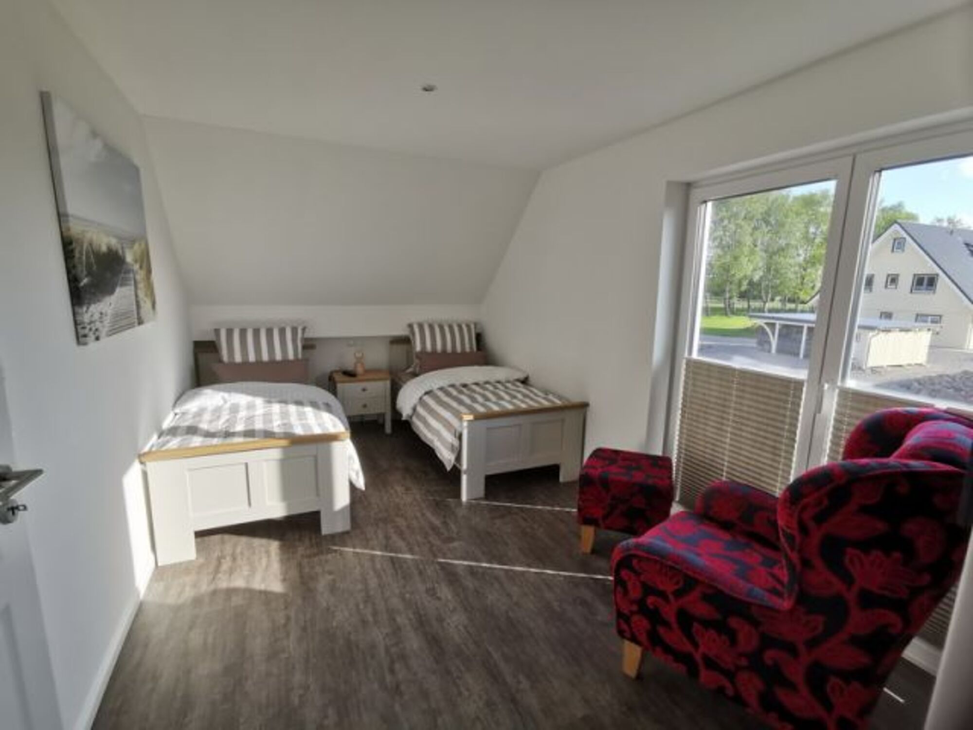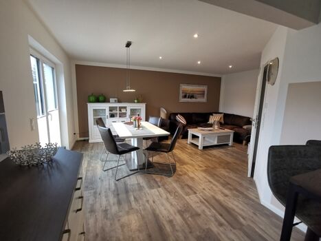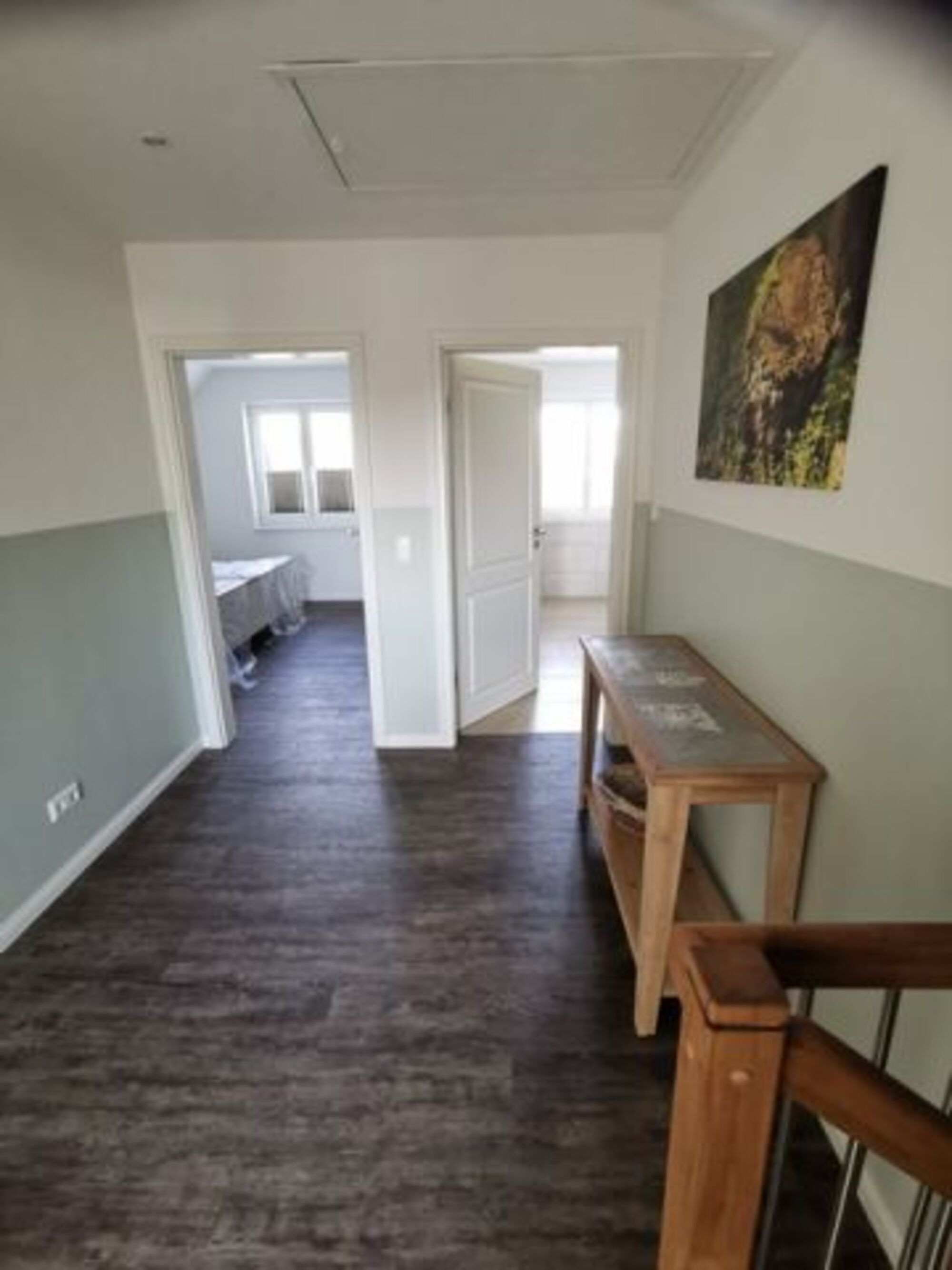 Westerhüs, Mittelhausteil -das exklusive Ferienhaus ist im Mai 2020 fertig gestellt. Es ist ein Massivholzhaus mit hervorragendem Raumklima, Wohlfühlambiente und excellenter Wärmedämmung. Das Ferienhaus befindet sich auf unserem Pferdehof mit Blick auf die Weiden. Im Erdgeschoss befindet sich ein Schlafzimmer mit Doppelbett und ein Bad mit Dusche / WC. Der großzügige Wohnraum mit Eßplatz und Landhausküche ist lichtdurchflutet. Von dort kommt man auf die möblierte West- Terrasse. Dieser Bereich ist 1,70m-1,80m hoch eingezäunt. Teilweise feste WPC Zaunelemente, daran angrenzend ein bepflanzter Natursteinwall mit zusätzlichem Dopplestabmattenzaun. Im Obergeschoß befindet sich ein Schlafzimmer mit Doppelbett und begehbarem Kleiderschrank und ein Schlafzimmer mit zwei Einzelbetten und auch hier ein begehbarer Kleiderschrank. Das geräumige Bad mit Doppelwaschtisch, Dusche und WC beherbergt auch eine hauseigene Sauna. Das gesamte Haus ist sehr hochwertig und gemütlich eingerichtet.