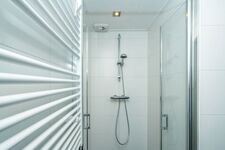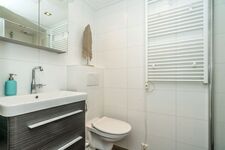 Das neue, moderne Badezimmer verfügt über eine Dusche, ein Waschbecken und eine extra Toilette.
