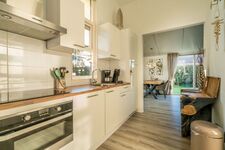 In der offenen Küche befinden sich unter anderem eine Induktionskochplatte, ein Geschirrspüler, ein Kühlschrank mit Gefrierfach und eine Kombi-Mikrowelle. Im Abstellraum befindet sich noch eine Waschmaschine.