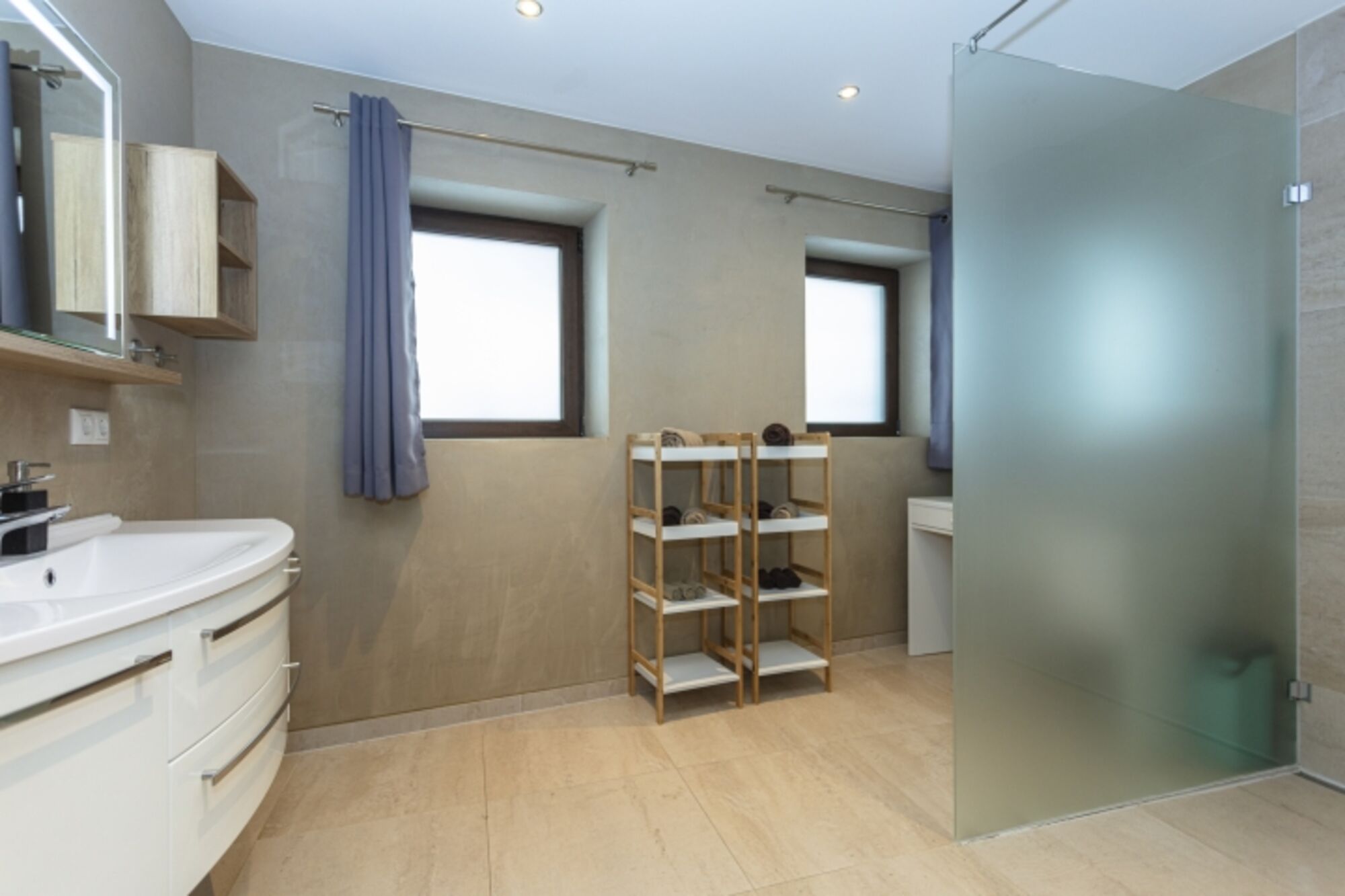 Doppelwaschbecken, Regendusche, Kosmetiktücher, Spiegel, Fenster im Bad