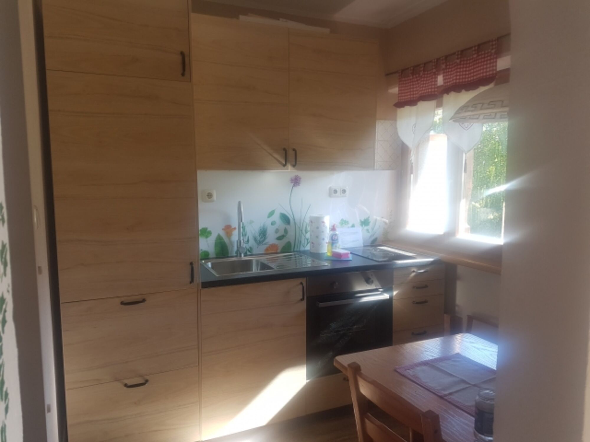 2-Platten Herd, Cerankochfeld, Eierkocher, Korkenzieher / Flaschenöffner, Gewürze (Salz, Pfeffer, Zucker), Geschirrhandtücher, Mülltüten, Essplatz in der Küche