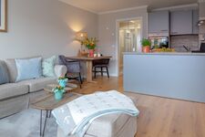 Die moderne und sehr elegant gestaltete Küche lädt zum Kochen ein und hält für Sie alles zur Verfügung, was Sie für die mühelose Selbstversorgung im Urlaub benötigen. Das Equipment dafür ist hochwertig und lässt keine Wünsche offen. Der große Esstisch mit bequemem Mobiliar bietet ein gelungenes Ambiente für gemeinsame Mahlzeiten.