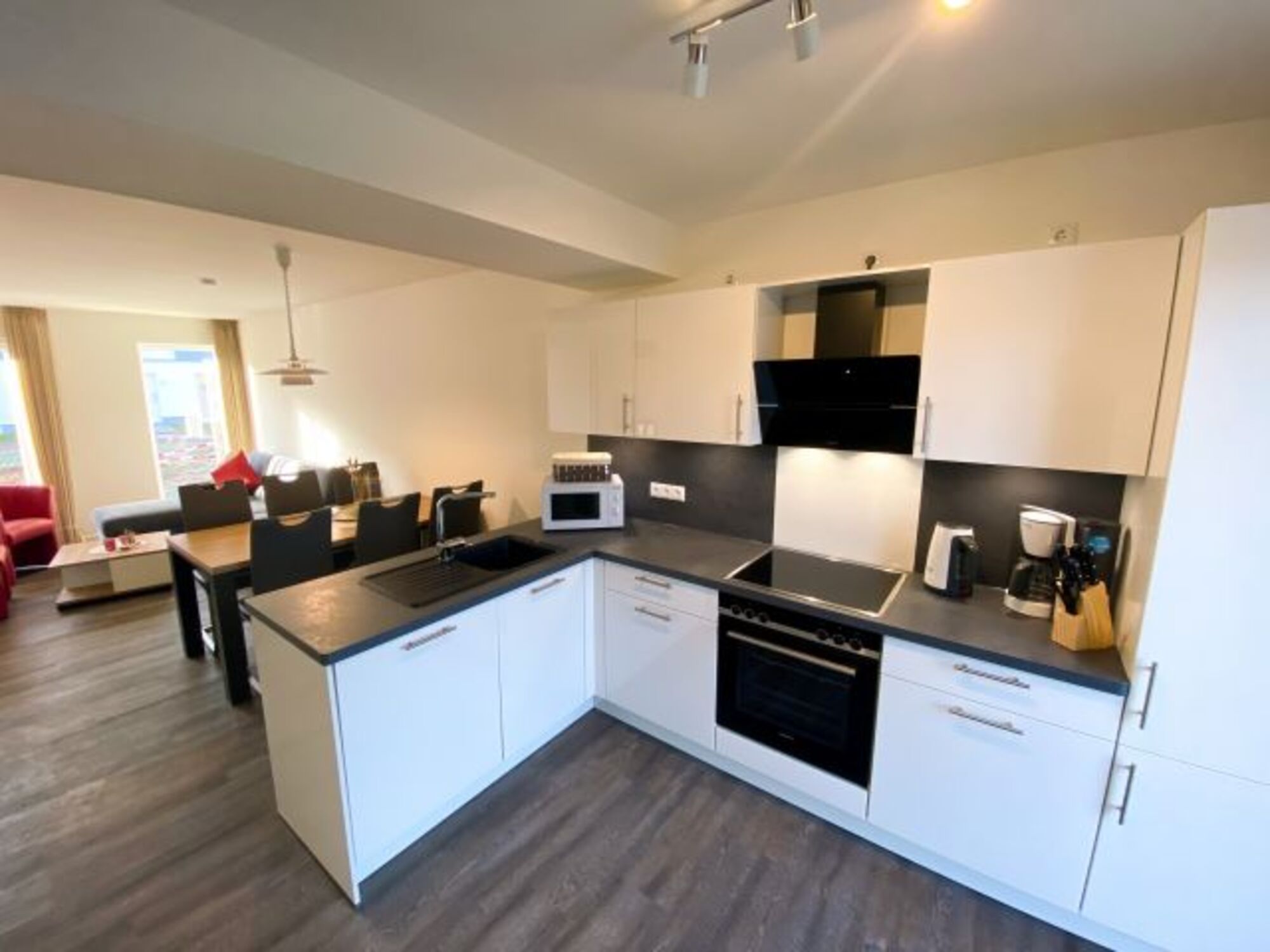 Über einen kleinen Windfang erreichen Sie den hellen und freundlichen Wohnbereich, die Küche ist offengehalten und mit einer hochwertigen Einbauküche inklusive Mikrowelle ausgestattet. Geschirr, Besteck, Gläser sowie Töpfe und Pfanne sind vorhanden.