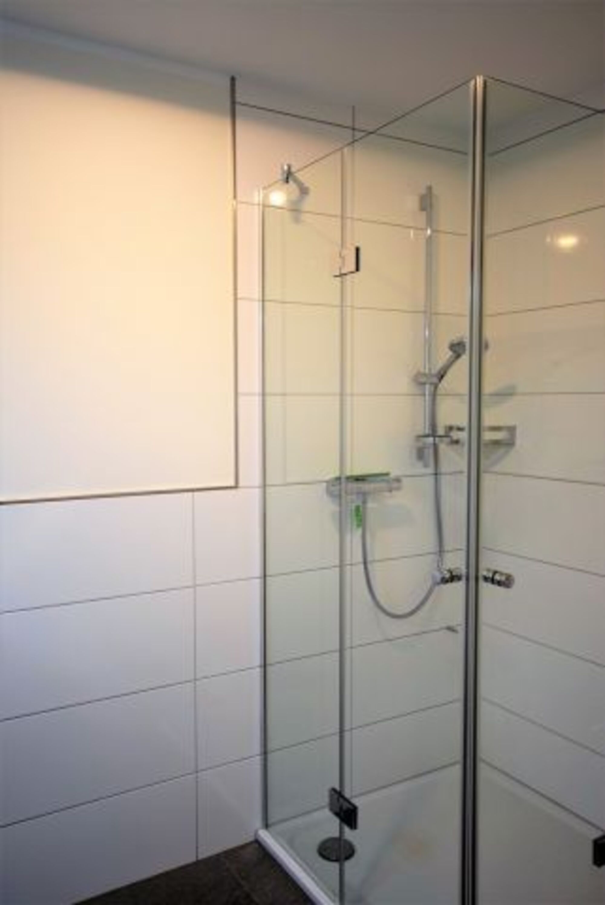 Im Badezimmer setzt sich die moderne Ausstattung der Wohnung fort. Die tiefe Dusche ist geräumig angelegt und mit einer Glastür verschlossen. Der Waschtisch mit großem Spiegel bietet zahlreiche Stell- und Aufbewahrungsmöglichkeiten. Ein Kosmetikspiegel ist ebenso vorhanden wie ein Handtuchwärmer.