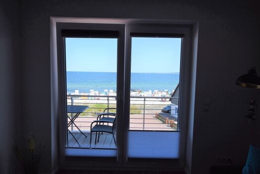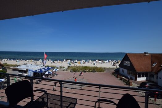 Vom großen Balkon aus kann der Blick direkt auf die Ostsee fallen. Dieser kann direkt vom Wohnzimmer aus betreten werden und überzeugt durch seine Ost-Lage. Durch seine Möblierung mit einem Tisch und -stühlen kann der Balkon vor allem in der warmen Jahreszeit als zweites Wohnzimmer fungieren.