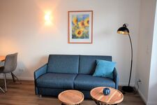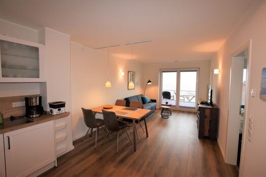 Gemeinsames Kochen und Klönen, gemütliches Entspannen auf der großzügigen Couch oder gemeinsame Mahlzeiten am Esstisch oder auf dem Balkon - all dies ermöglicht der lichtdurchflutete Wohnraum der Ferienwohnung. Große Fenster und eine ansprechende, moderne Einrichtung runden den Raum ab. Ein Flachbild-Fernseher und DVD-Player vertreiben auch an regnerischen Tagen Langeweile.