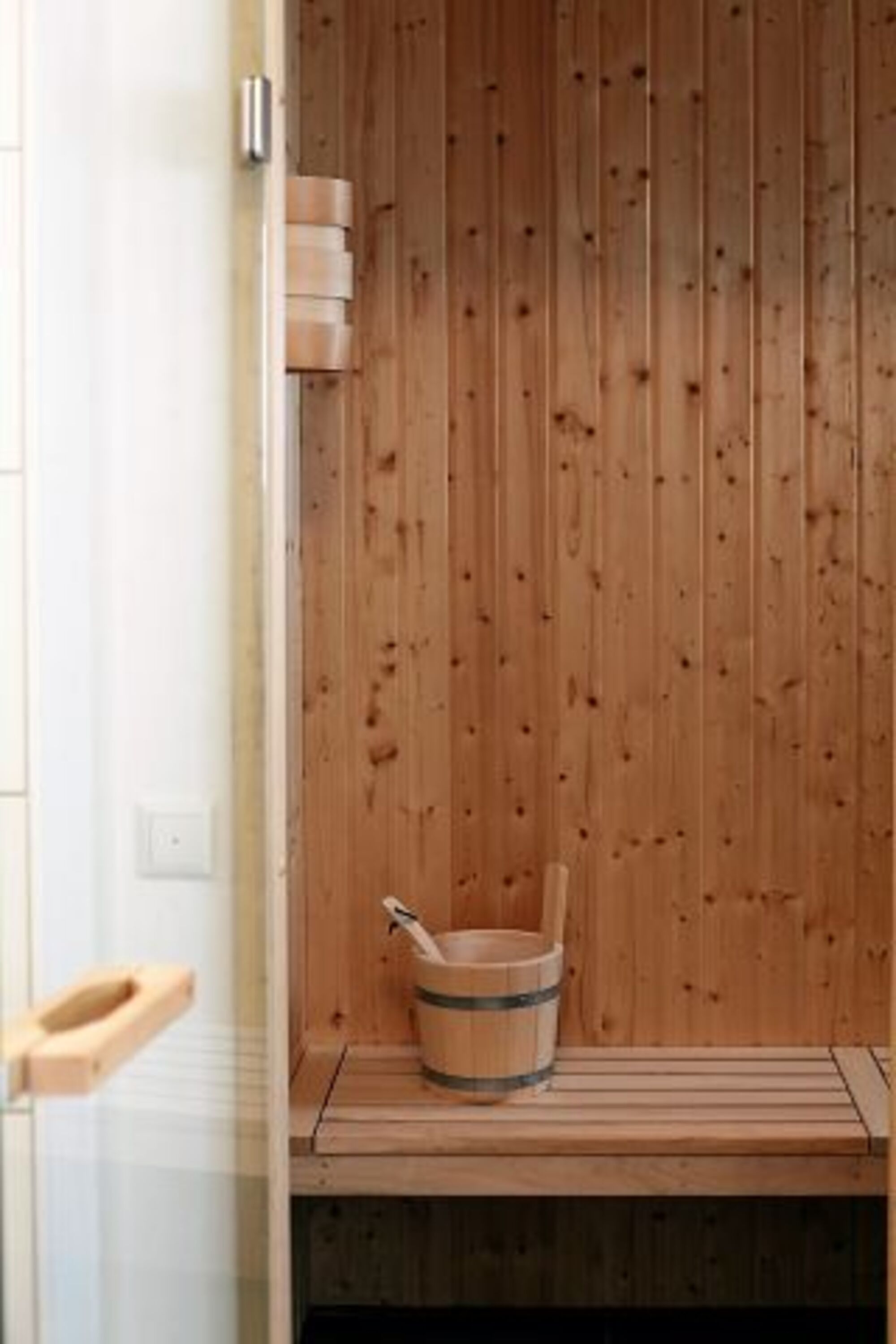 Eine Sauna, eine ebenerdige Dusche und eine Badewanne bieten den nötigen Komfort zur Erholung.