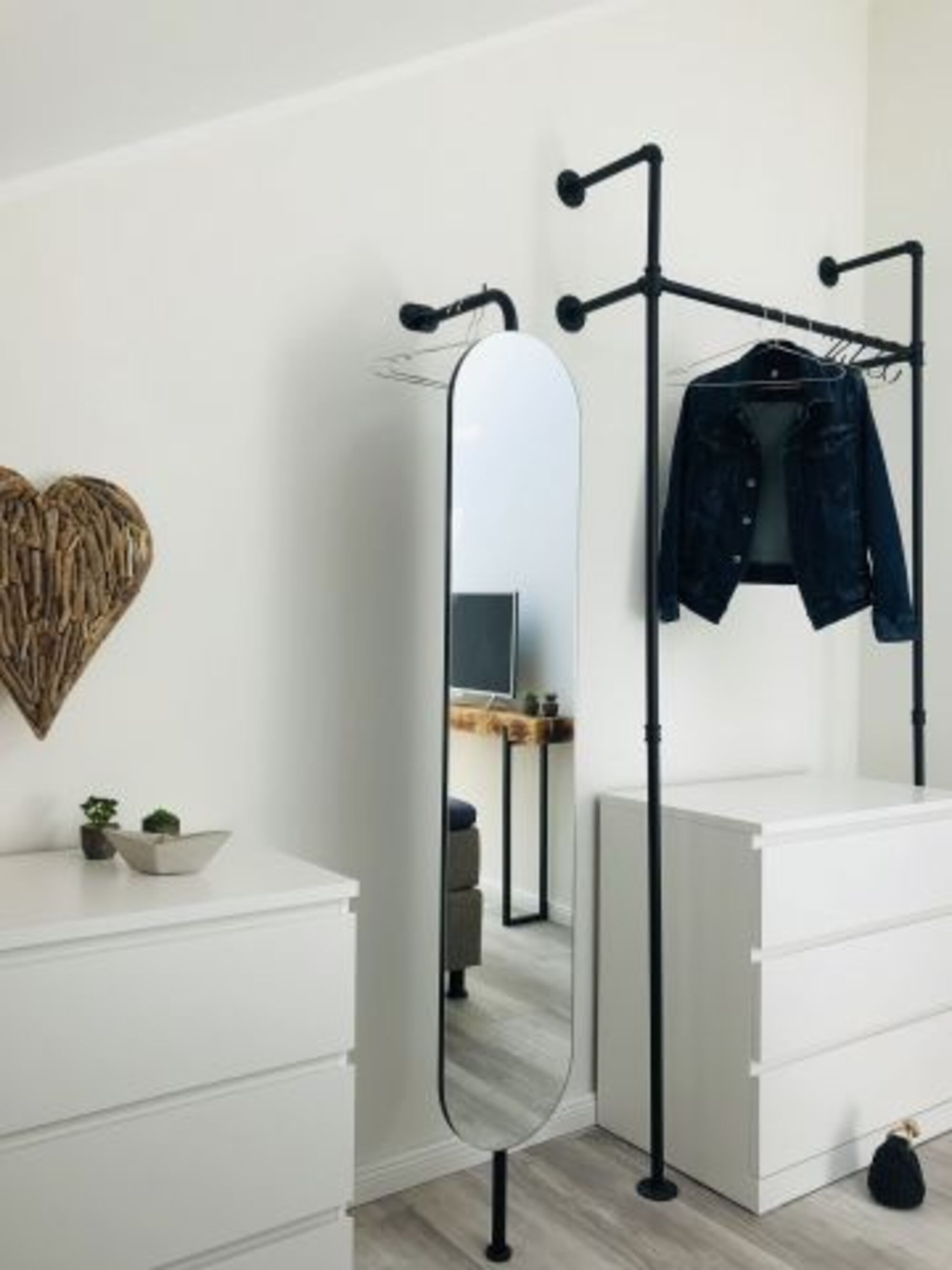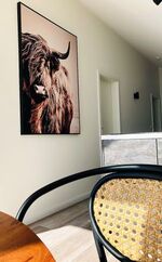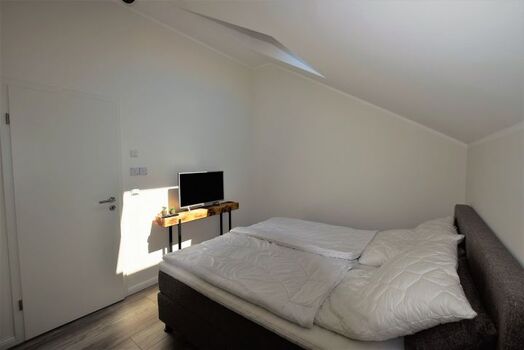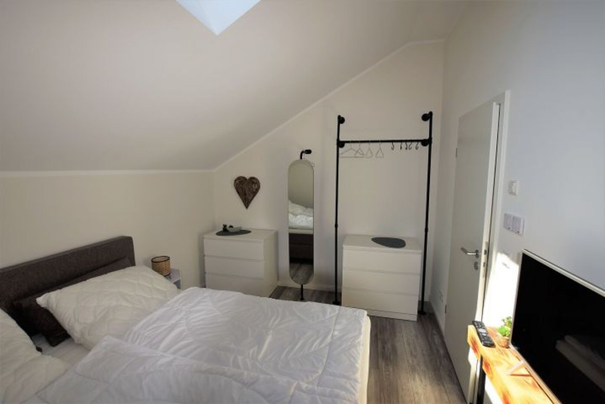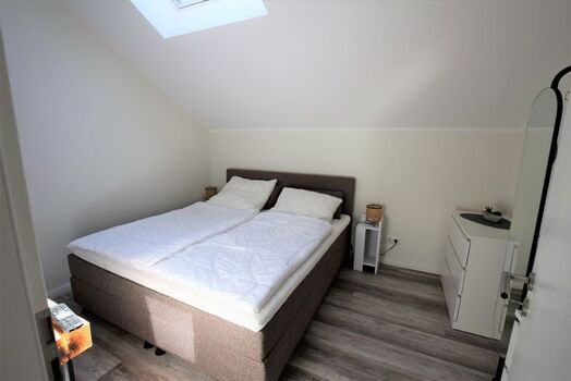 Das Schlafzimmer ist mit einem bequemen Boxspring-Doppelbett und verdunkelbaren Dachfenstern ideal für nächtlichen Komfort eingerichtet. Ein Kleiderschrank und ein Ganzkörperspiegel runden die Einrichtung des Zimmers ab. Im Schlafzimmer ist zudem ein weiterer Fernseher vorhanden.