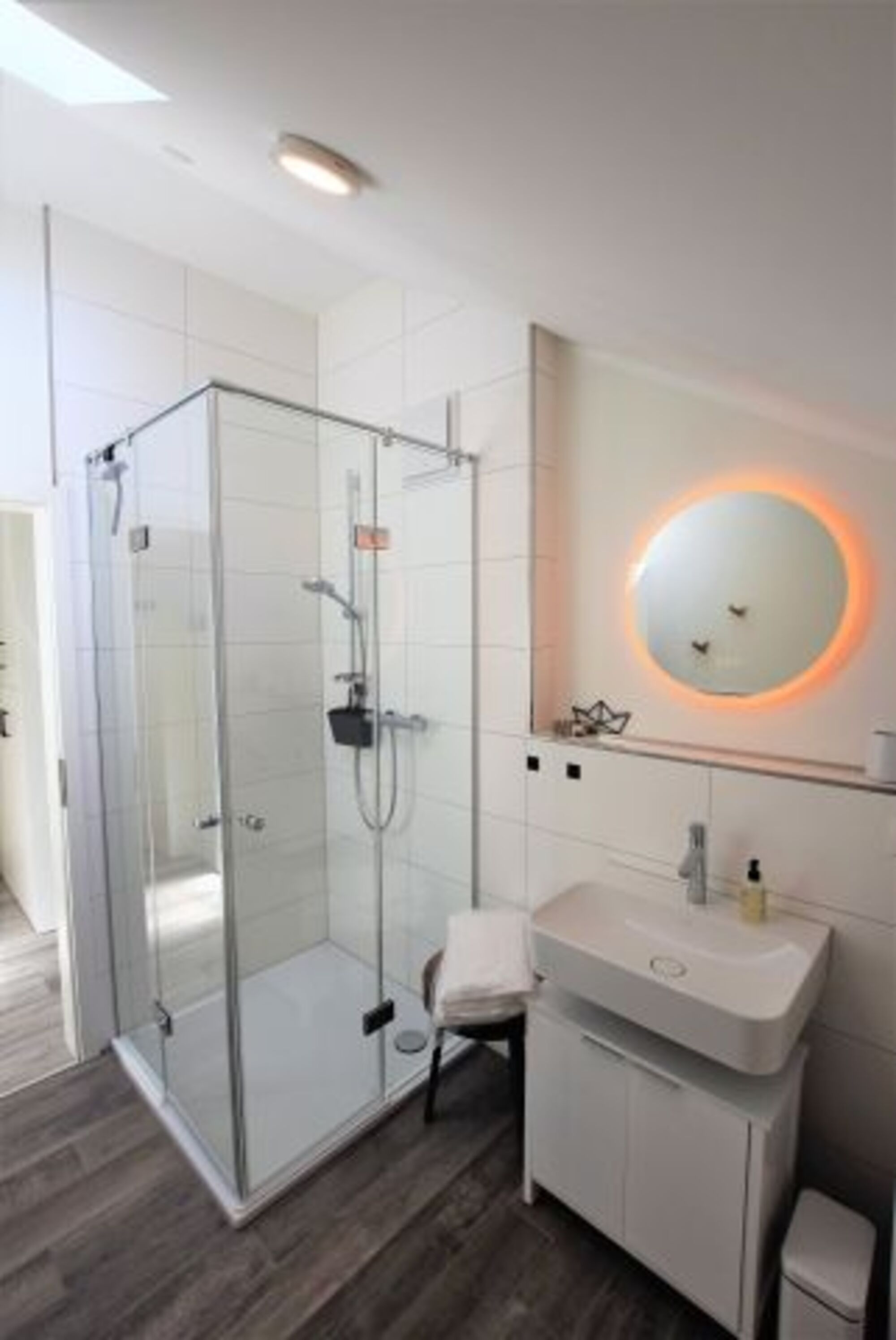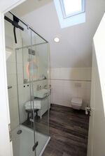 Das Badezimmer mit Dusche ist hell gefliest und modern ausgestattet. Die Dusche ist bodentief und mit einer Glastür zu verschließen. Der Waschtisch mit großem Spiegel wird ebenso wie der Rest des Raumes von einem Deckenspot beleuchtet und bietet reichlich Staufläche. Ein Föhn ist hier ebenso vorhanden wie ein Handtuchwärmer, so dass das Bad keine Wünsche offen lässt. Im „Strandkieker“ steht zudem eine Waschmaschine zur Verfügung.